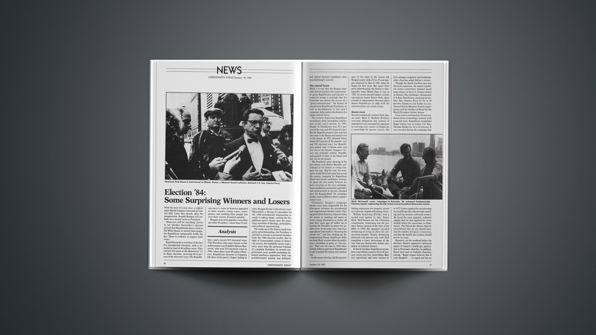 In state contests as well as national races, candidates parried with the notion that religion and politics do not mix. In 1980 and 1982, prolife activists and evangelicals were rebuffed by Minnesota’s Independent Republican party. They were brushed off as overzealous amateurs and scorned as single-issue activists. In a reversal of the proverbial phrase, these committed people apparently decided, “If you can’t join ’em, lick ’em.” Flooding last year’s party caucuses, they virtually took over the state’s Republican party (CT, Sept. 21, 1984, p. 68). As a result, 14 out of 17 new Republicans in the Minnesota House of Representatives, many of them evangelicals, are opposed to abortion. U.S. Sen. Rudy Boschwitz (R-Minn.), who is Jewish, applauded the entry of so many Christians into the party. With his prolife commitment, Boschwitz handily won a second term in the senate.