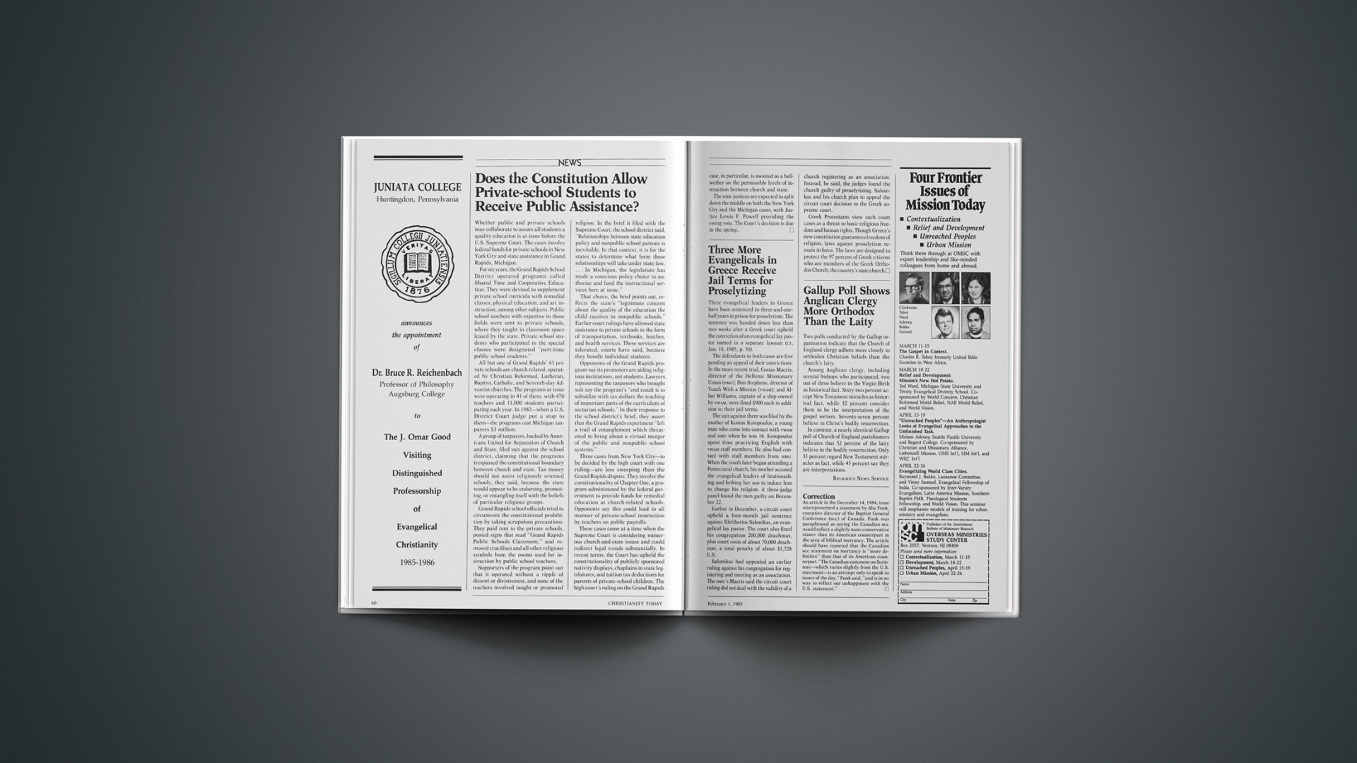 An article in the December 14, 1984, issue misrepresented a statement by Abe Funk, executive director of the Baptist General Conference (BGC) of Canada. Funk was paraphrased as saying the Canadian BGC would reflect a slightly more conservative stance than its American counterpart in the area of biblical inerrancy. The article should have reported that the Canadian BGC statement on inerrancy is “more definitive” than that of its American counterpart. “The Canadian statement on Scripture—which varies slightly from the U.S. statement—is an attempt only to speak to issues of the day,” Funk said, “and is in no way to reflect our unhappiness with the U.S. statement.”