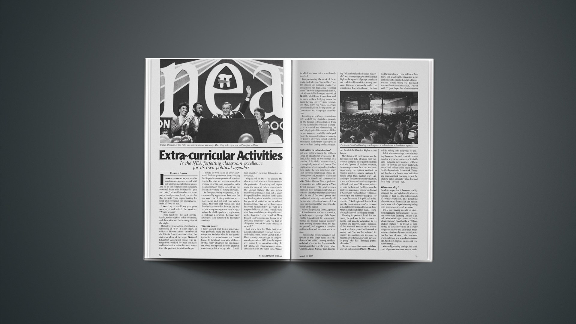 Organized in 1857 “to elevate the character and advance the interests of the profession of teaching, and to promote the cause of public education in the United States,” the NEA, whose membership includes four out of every five public school teachers in the country, has long since added extracurricular political activities to its school-house agenda. “We feel we have a professional responsibility, as well as a responsibility as citizens, to make sure that those candidates seeking office deal with education,” NEA president Mary Futrell told CHRISTIANITY TODAY in an exclusive interview. “And we feel an obligation to work for those candidates as well.”