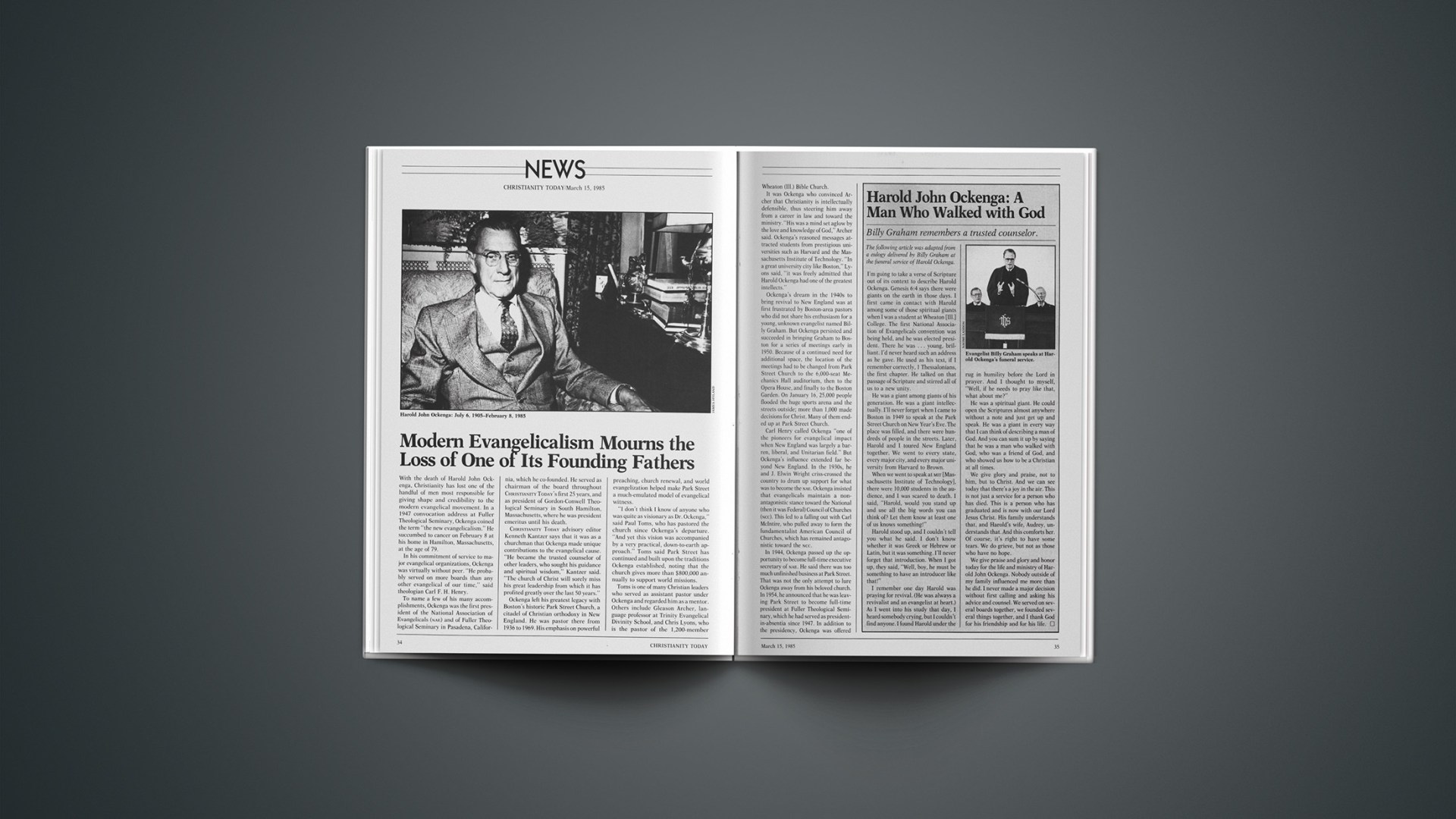 CHRISTIANITY TODAY advisory editor Kenneth Kantzer says that it was as a churchman that Ockenga made unique contributions to the evangelical cause. “He became the trusted counselor of other leaders, who sought his guidance and spiritual wisdom,” Kantzer said. “The church of Christ will sorely miss his great leadership from which it has profited greatly over the last 50 years.”