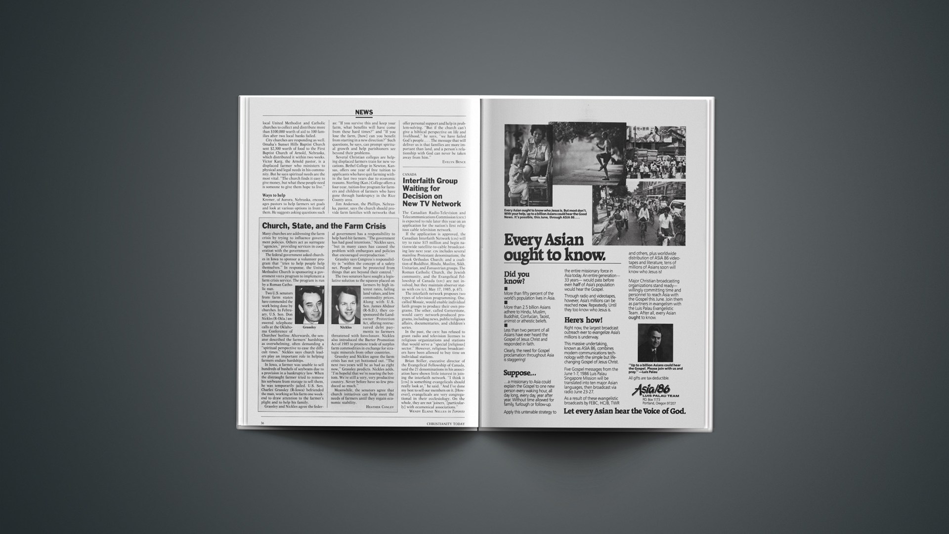 If the application is approved, the Canadian Interfaith Network (CIN) will try to raise $15 million and begin nationwide satellite-to-cable broadcasting late next year, CIN includes several mainline Protestant denominations; the Greek Orthodox Church; and a coalition of Buddhist, Hindu, Muslim, Sikh, Unitarian, and Zoroastrian groups. The Roman Catholic Church, the Jewish community, and the Evangelical Fellowship of Canada (EFC) are not involved, but they maintain observer status with CIN (CT, May 17, 1985, p. 67).