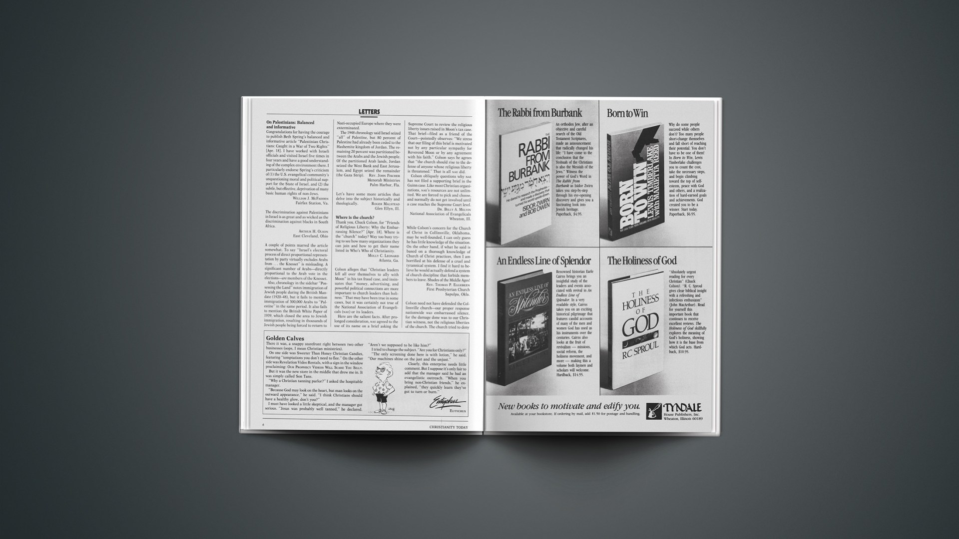 Congratulations for having the courage to publish Beth Spring’s balanced and informative article “Palestinian Christians: Caught in a War of Two Rights” [Apr. 18]. I have worked with Israeli officials and visited Israel five times in four years and have a good understanding of the complex environment there. I particularly endorse Spring’s criticism of (1) the U.S. evangelical community’s unquestioning moral and political support for the State of Israel, and (2) the subtle, but effective, deprivation of many basic human rights of non-Jews.