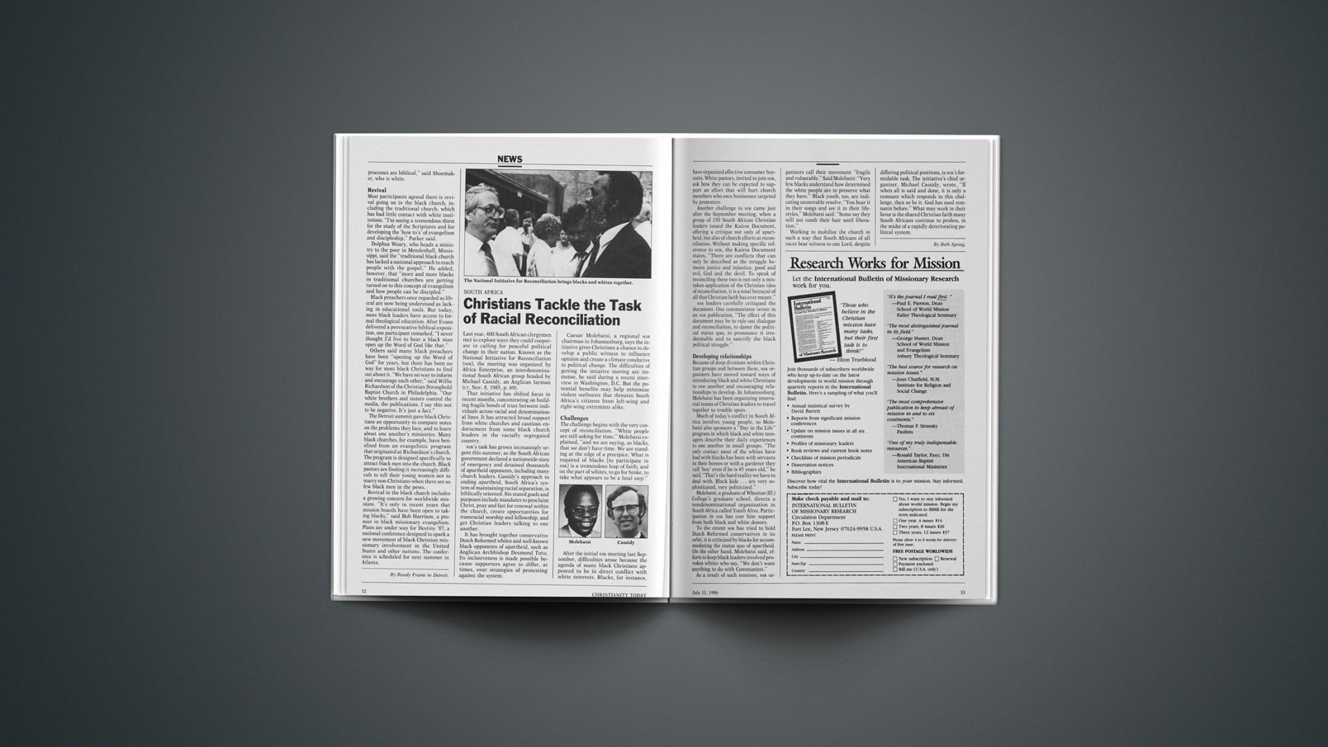 Last year, 400 South African clergymen met to explore ways they could cooperate in calling for peaceful political change in their nation. Known as the National Initiative for Reconciliation (NIR), the meeting was organized by Africa Enterprise, an interdenominational South African group headed by Michael Cassidy, an Anglican layman (CT, Nov. 8, 1985, p. 69).