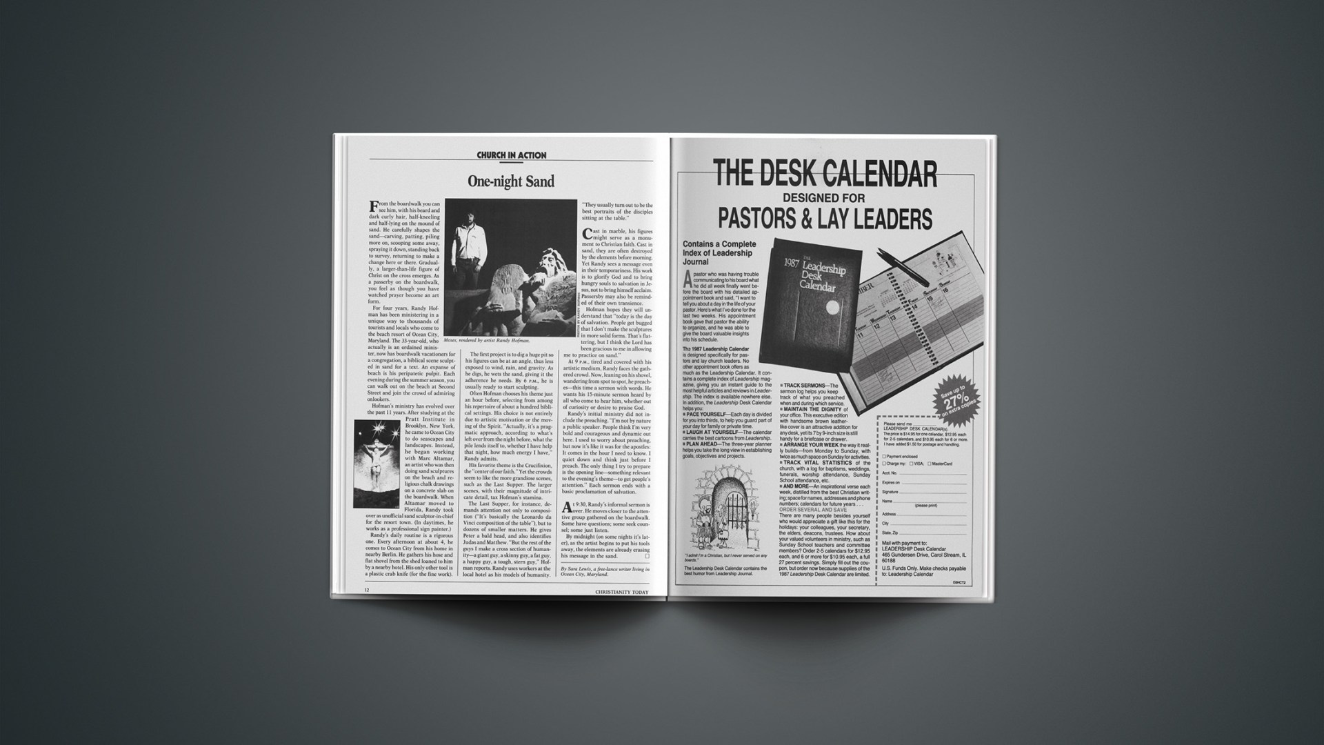 For four years, Randy Hofman has been ministering in a unique way to thousands of tourists and locals who come to the beach resort of Ocean City, Maryland. The 33-year-old, who actually is an ordained minister, now has boardwalk vacationers for a congregation, a biblical scene sculpted in sand for a text. An expanse of beach is his peripatetic pulpit. Each evening during the summer season, you can walk out on the beach at Second Street and join the crowd of admiring onlookers.