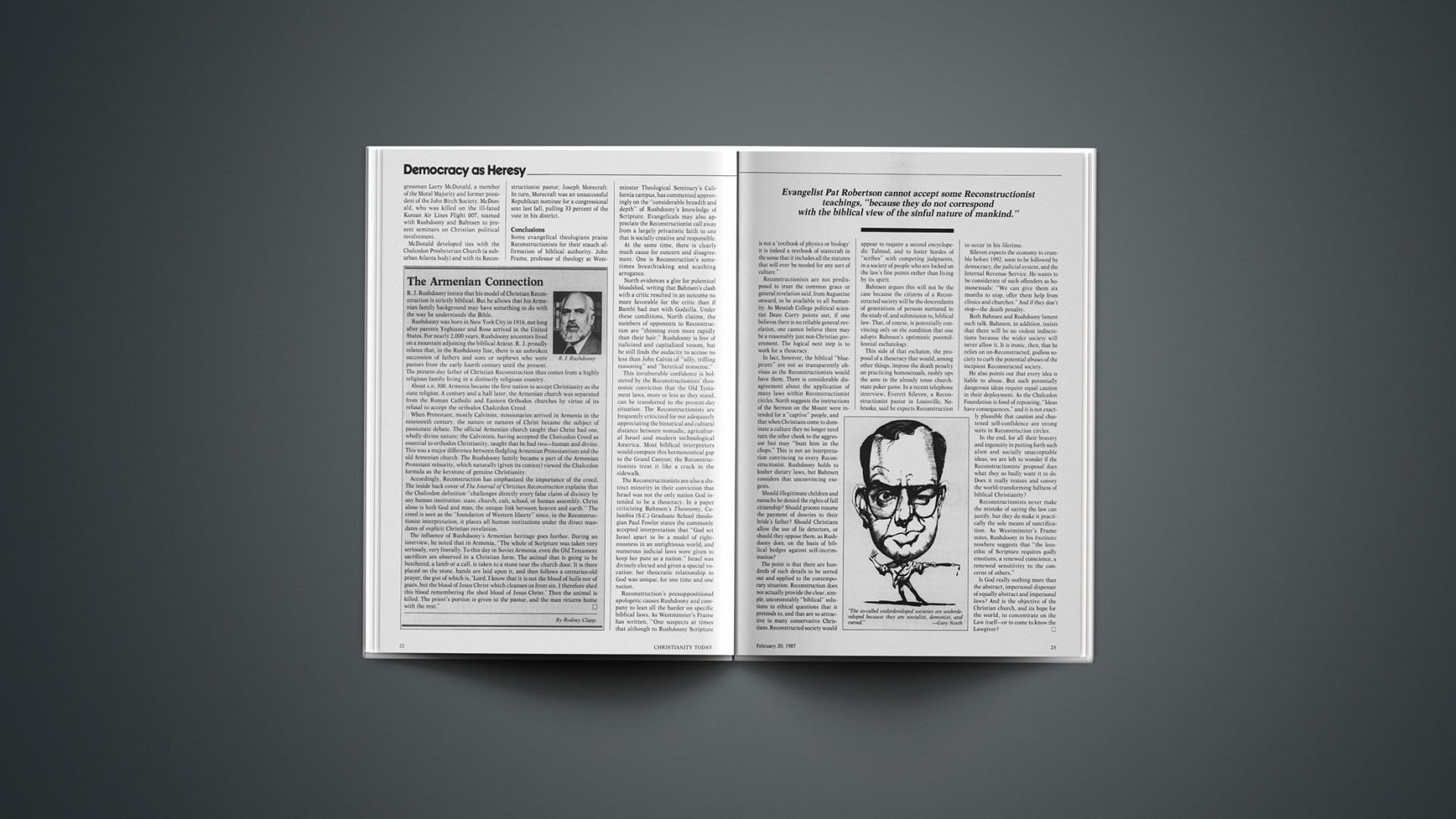 R. J. Rushdoony insists that his model of Christian Reconstruction is strictly biblical. But he allows that his Armenian family background may have something to do with the way he understands the Bible.