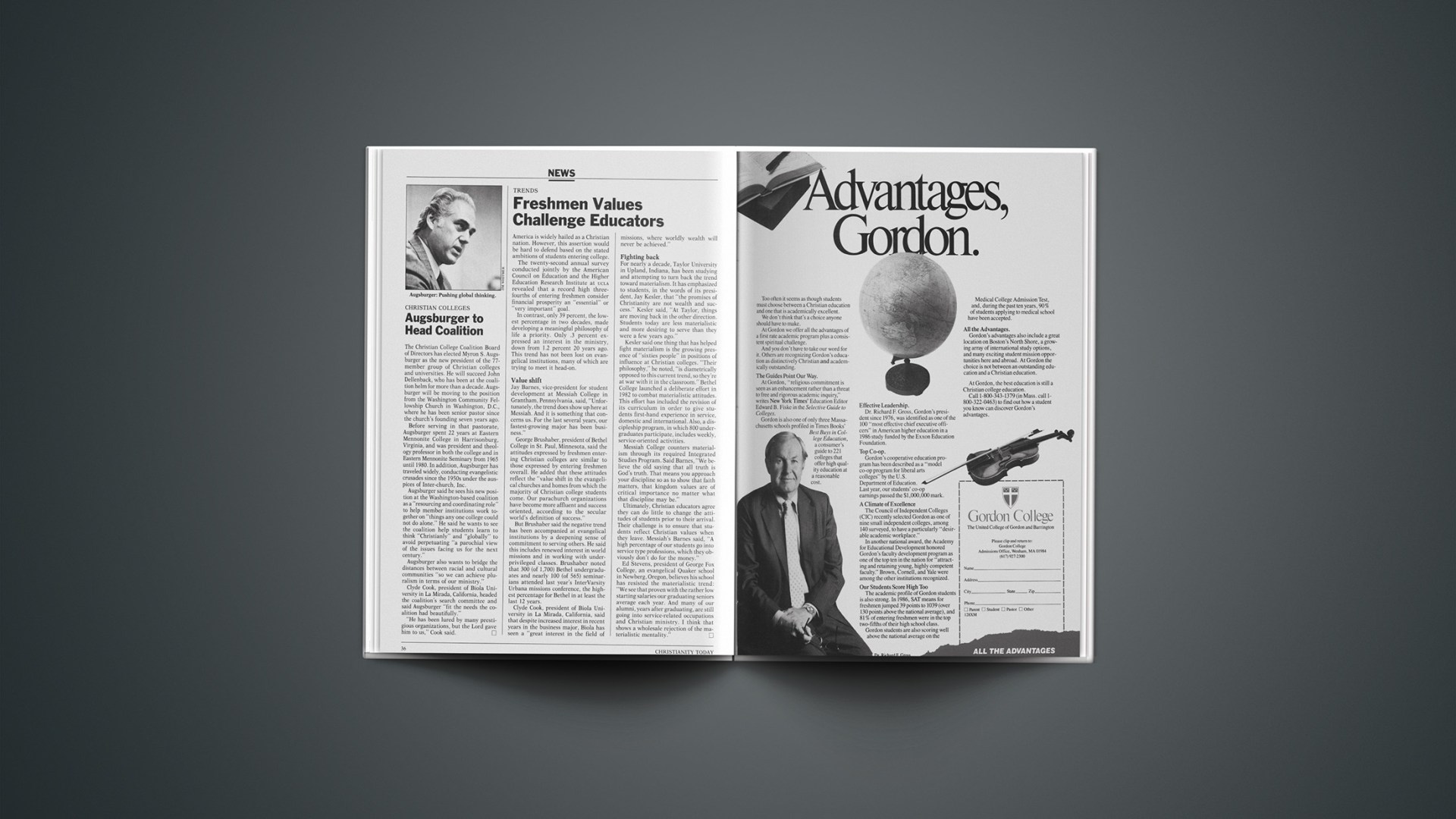 George Brushaber, president of Bethel College in St. Paul, Minnesota, said the attitudes expressed by freshmen entering Christian colleges are similar to those expressed by entering freshmen overall. He added that these attitudes reflect the “value shift in the evangelical churches and homes from which the majority of Christian college students come. Our parachurch organizations have become more affluent and success oriented, according to the secular world’s definition of success.”