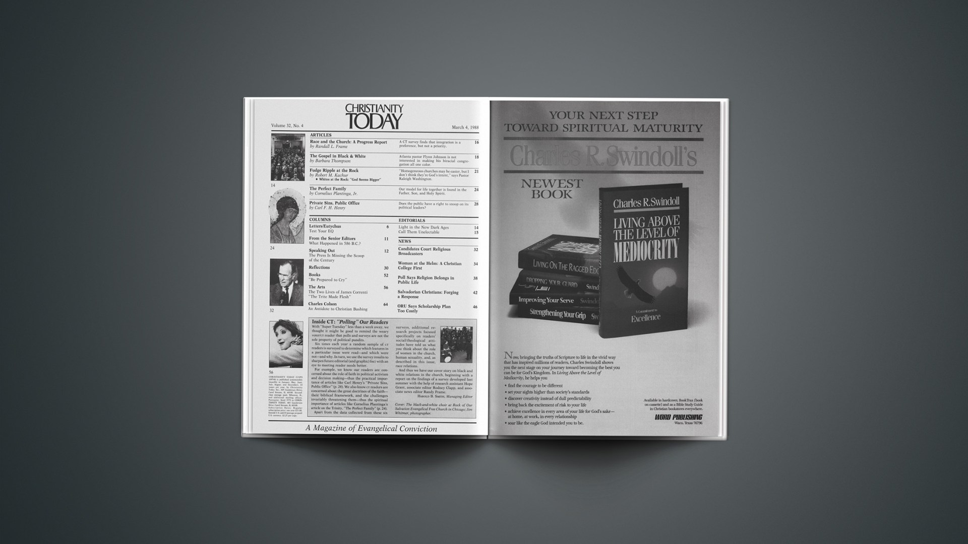 And thus we have our cover story on black and white relations in the church, beginning with a report on the findings of a survey developed last summer with the help of research assistant Hope Grant, associate editor Rodney Clapp, and associate news editor Randy Frame.