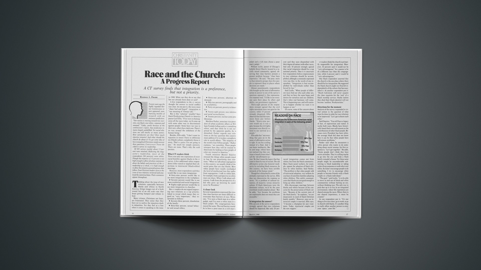 Of 505 surveys mailed, about 13 percent were returned. Reflecting the magazine’s readership, most of the respondents (94 percent) were white. Though the response of 13 percent is not high enough to allow absolute statements about the beliefs and practices of the CT readership as a whole, it is high enough to allow the tentative generalizations that follow. Four Christian leaders close to the issue of race relations reviewed and analyzed the statistical data. Their comments appear throughout.