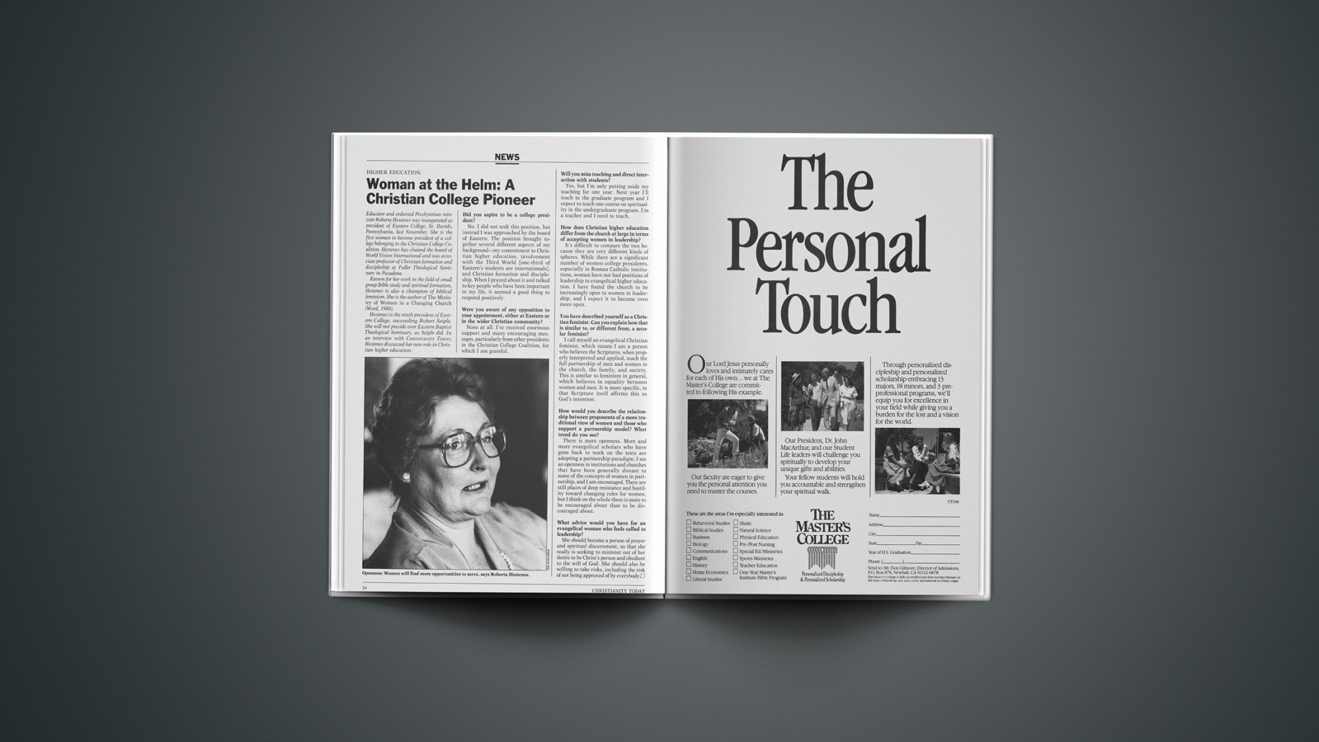 Educator and ordained Presbyterian minister Roberta Hestenes was inaugurated as president of Eastern College, St. Davids, Pennsylvania, last November. She is the first woman to become president of a college belonging to the Christian College Coalition. Hestenes has chaired the board of World Vision International and was associate professor of Christian formation and discipleship at Fuller Theological Seminary in Pasadena.