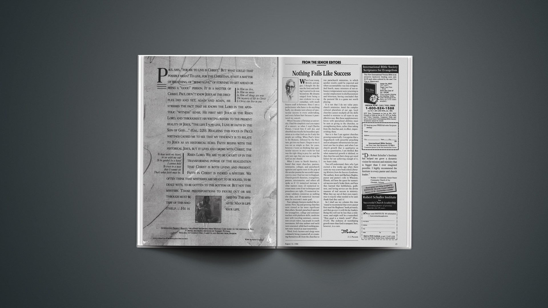 You will understand, then, why I got excited a few weeks ago when there came my way a new book titled Liberating Ministry from the Success Syndrome. The authors, Kent and Barbara Hughes, pastor and pastor’s wife in Wheaton, Illinois, tell how the quest for numerical success nearly broke them, and how they learned that faithfulness, godliness, and loving service are the divine measure of real success in ministry. What they say out of their own experience is exactly what needed to be said; thank God they said it!