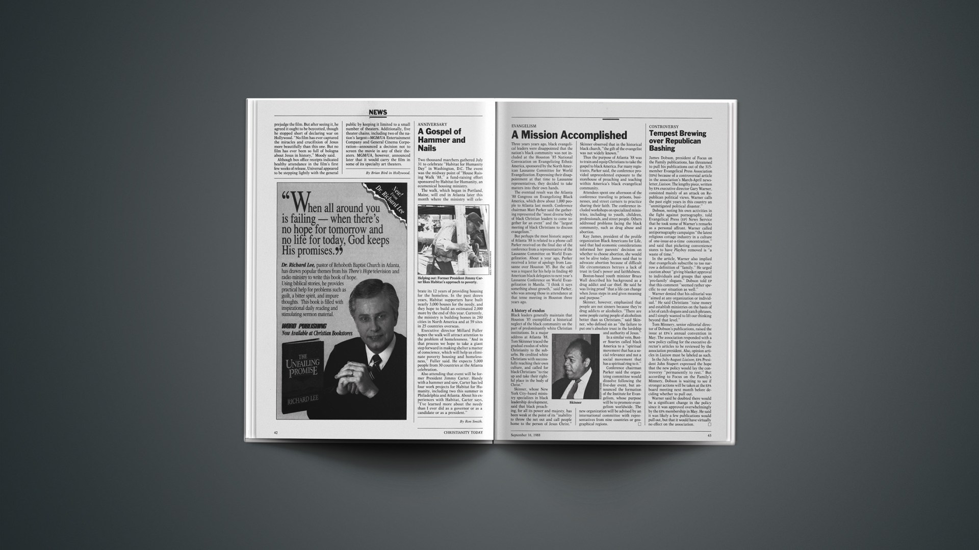James Dobson, president of Focus on the Family publications, has threatened to pull his publications out of the 315-member Evangelical Press Association (EPA) because of a controversial article in the association’s March–April newsletter, Liaison. The lengthy piece, written by EPA executive director Gary Warner, consisted mainly of an attack on Republican political views. Warner calls the past eight years in this country an “unmitigated political disaster.”
