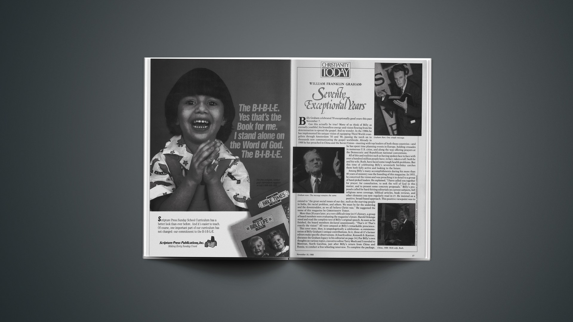 This cover story, then, is unapologetically a celebration—a commemoration of Billy Graham’s unique contributions. In it, three of CT’s former editors make specific observations. (A fourth editor, Kenneth S. Kantzer, discusses the Graham legacy in his editorial on page 14.) For Billy’s own thoughts on various topics, executive editor Terry Muck and I traveled to Montreat, North Carolina, just after Billy’s return from China and Russia, to conduct a free-wheeling interview. To complete the package, University of Chicago historian Martin Marty writes a personal retrospective.