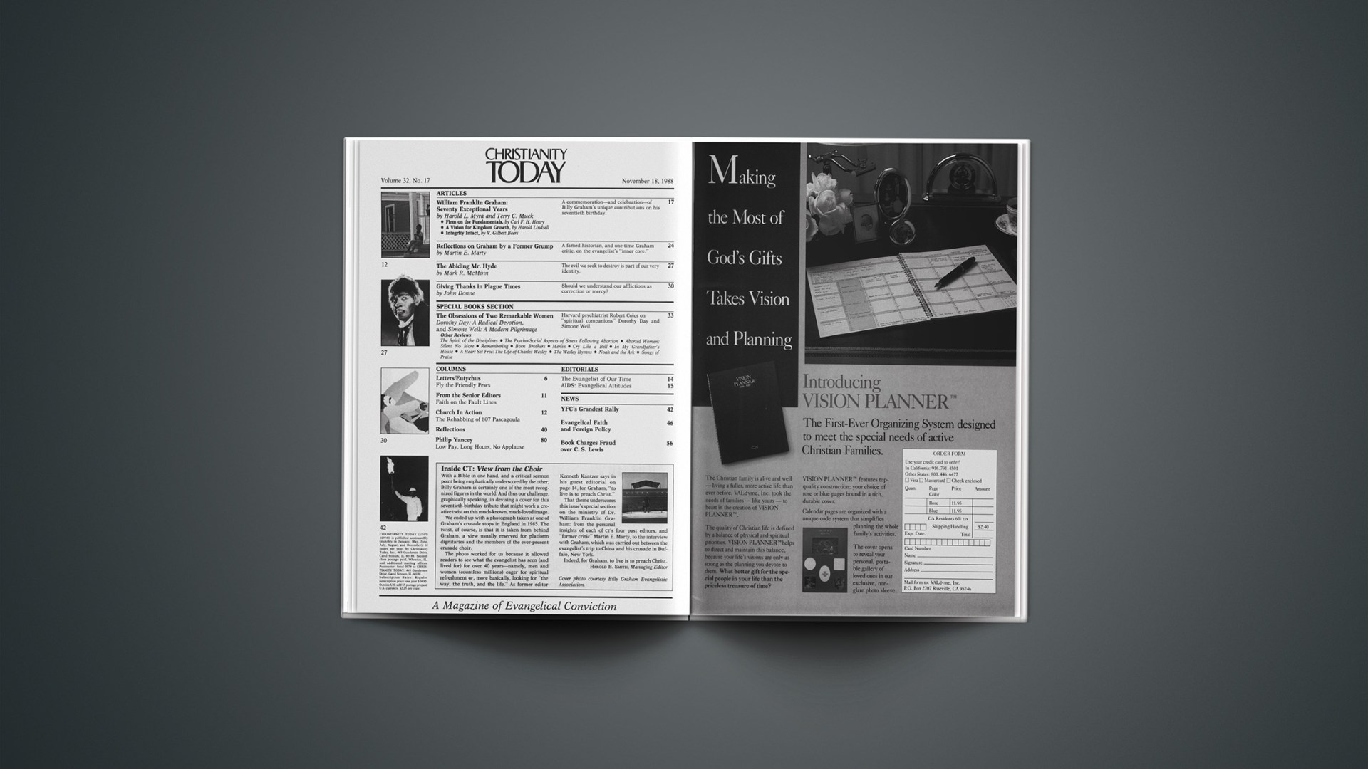 William Franklin Graham: from the personal insights of each of CT’S four past editors, and “former critic” Martin E. Marty, to the interview with Graham, which was carried out between the evangelist’s trip to China and his crusade in Buffalo, New York.
