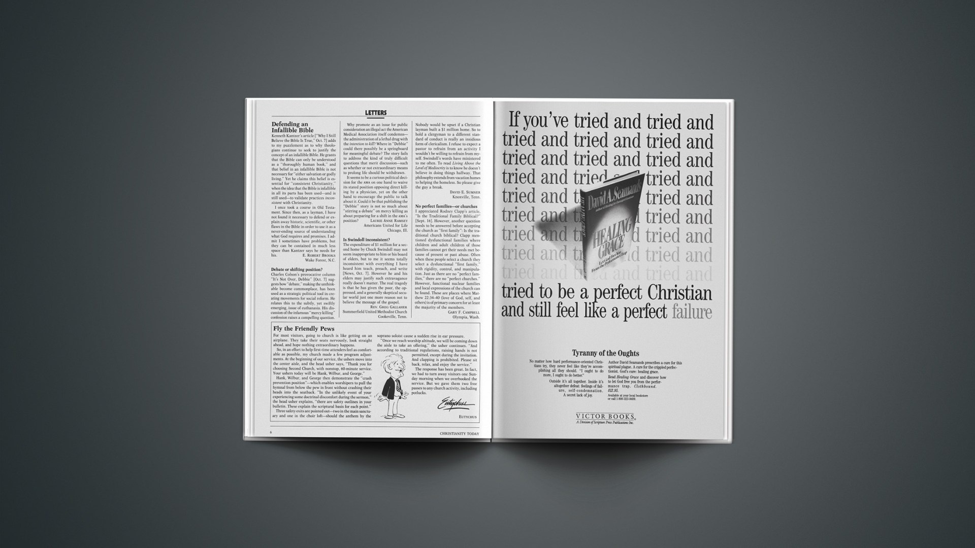 The expenditure of $1 million for a second home by Chuck Swindoll may not seem inappropriate to him or his board of elders, but to me it seems totally inconsistent with everything I have heard him teach, preach, and write [News, Oct. 7]. However he and his elders may justify such extravagance really doesn’t matter. The real tragedy is that he has given the poor, the oppressed, and a generally skeptical secular world just one more reason not to believe the message of the gospel.