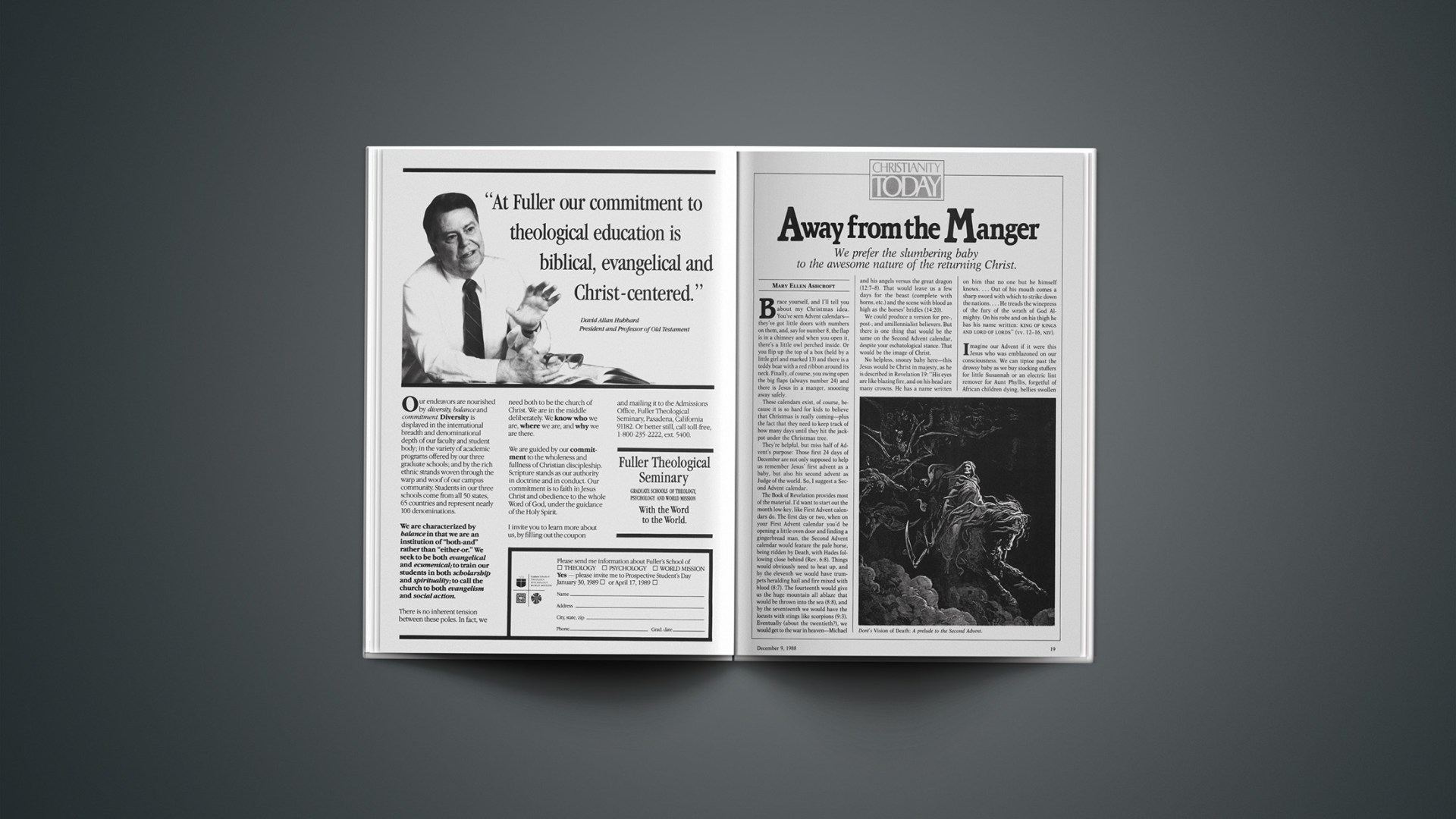 Imagine our Advent if it were this Jesus who was emblazoned on our consciousness. We can tiptoe past the drowsy baby as we buy stocking stuffers for little Susannah or an electric lint remover for Aunt Phyllis, forgetful of African children dying, bellies swollen and flies swarming around their eyes. But it would be ridiculous to try to sneak past this Jesus, his eyes aflame. We would squirm when we gave a cute Christmas mug (penguins in red-and-green top hats) to Betty at work—we’d keep waiting for just the right opportunity to tell her about Christ—knowing she would face those blazing eyes one day.