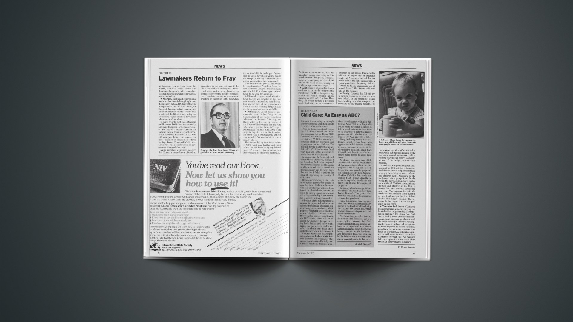 Prior to the congressional recess, the U.S. Senate passed the Democrat-sponsored Act for Better Child Care (ABC) bill, which proposes giving states $1.75 billion annually to subsidize child-care providers and help parents pay for child care. The bill calls for the allotment of an additional $10.5 billion between fiscal years 1990 and 1994 in tax credits to needy families with children.