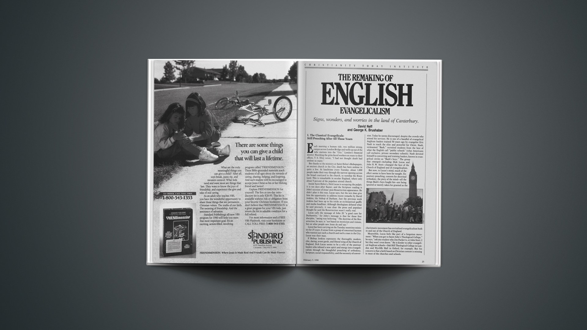 If Bishop Jenkins represents the thoroughly modern, chic, daring, avant garde, and liberal wing of the Church of England, Dick Lucas seems to be a relic of the postwar leaders who infused a new spirit and energy into evangelicalism through the thoughtful preaching of orthodoxy, Scripture, social responsibility, and the necessity of conversion. Today he seems discouraged, despite the crowds who attend his services. He is one of a handful of evangelical Anglican leaders trained 50 years ago by evangelist Eric Nash to reach the elite and powerful for Christ. Nash, nicknamed “Bash,” recruited students from the best of what the English call “public schools” (what Americans call exclusive, private secondary schools). Nash devoted himself to converting and training leaders, known in evangelical circles as “Bash’s boys.” The group that emerged—including Dick Lucas and John R. W. Stott—changed the face of the Church of England and of evangelicalism.