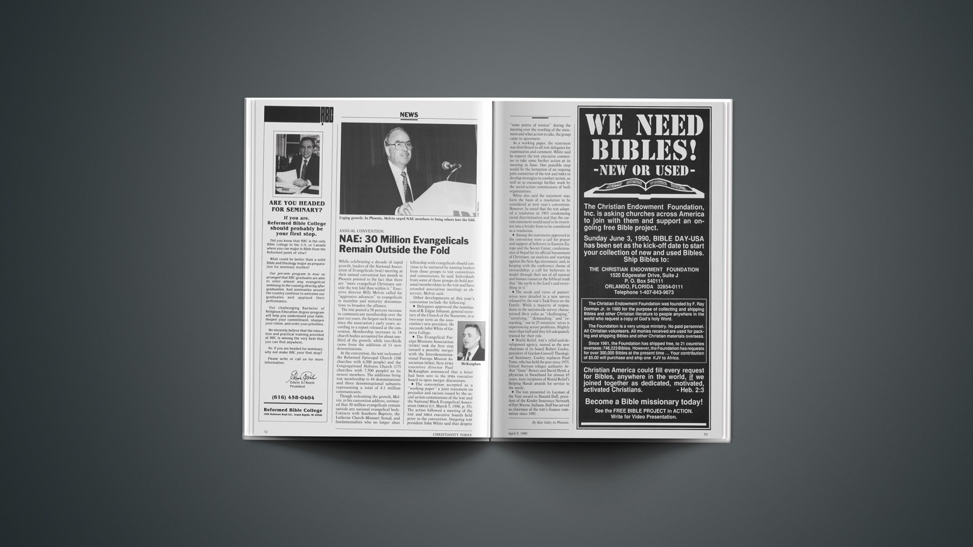 • The convention accepted as a “working paper” a joint statement on prejudice and racism issued by the social action commissions of the NAE and the National Black Evangelical Association (NBEA) (CT, March 5, 1990, p. 35). The action followed a meeting of the NAE and NBEA executive boards held prior to the convention. Outgoing NAE president John White said that despite “some points of tension” during the meeting over the wording of the statement and what action to take, the group came to agreement.