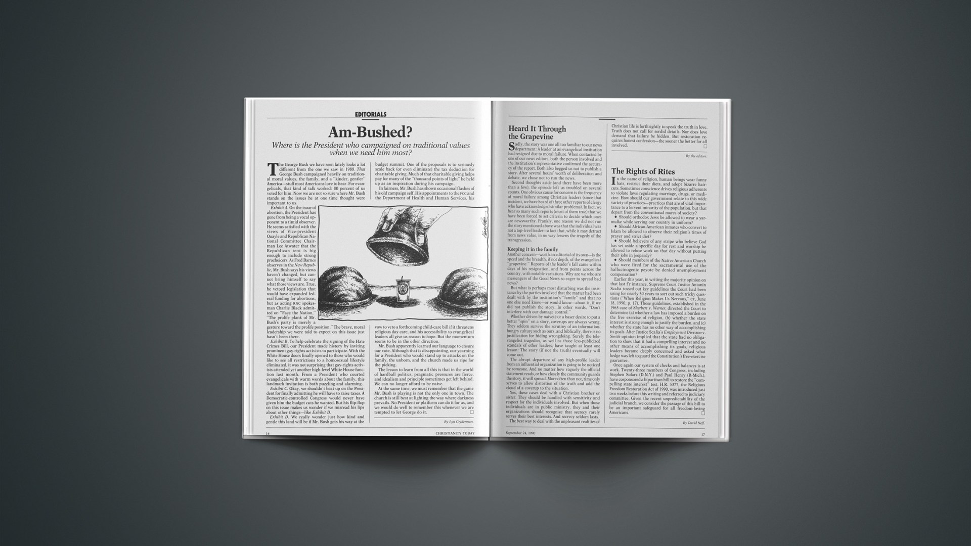 The George Bush we have seen lately looks a lot different from the one we saw in 1988. That George Bush campaigned heavily on traditional moral values, the family, and a “kinder, gentler” America—stuff most Americans love to hear. For evangelicals, that kind of talk worked: 80 percent of us voted for him. Now we are not so sure where Mr. Bush stands on the issues he at one time thought were important to us.