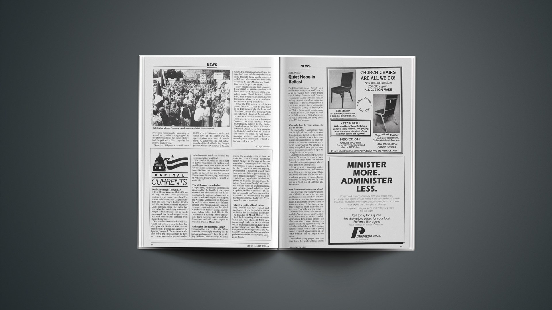 The Belfast YMCA stands—literally—as a link between two separate worlds. Located in the “neutral zone” of the divided city, it brings Protestant and Catholic young people together within its walls for training, recreation, and reconciliation. The Belfast “Y” fills its programs with a clear gospel message, due in large part to the evangelical faith of its director, Gerald Clark. A former Anglican missionary to South America, Clark began his work at the Belfast YMCA in 1982. CHRISTIANITY TODAY spoke with him during a visit to the U.S. last summer.