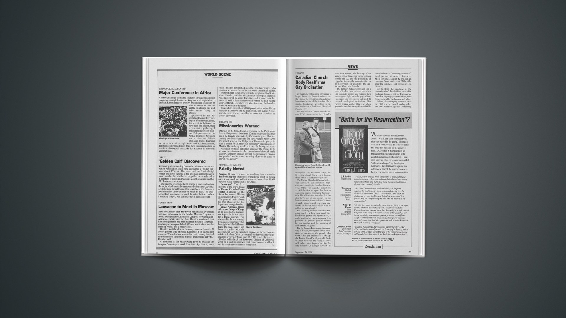 Killed: Anglican Bishop Alexander ’Muge of Kenya in an automobile accident on August 14 in the country’s Busia district. Two days earlier he was warned by a cabinet minister that he might be killed if he entered the area. ’Muge had been in conflict with the government over the unsolved murder of former foreign minister Robert Ouko. CT reported earlier on an unrelated incident involving ’Muge (July 16, 1990, p. 44). He recently offended officials of the Episcopal Diocese of California when on a visit he observed that “homosexuals and lesbians have taken over church leadership.”