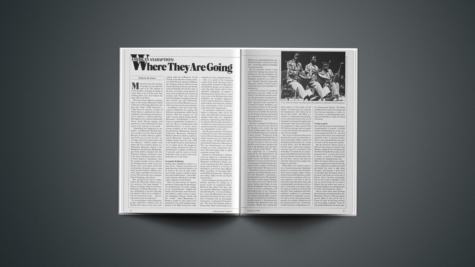 The recovery of spiritual distinctives has been fed, in part, by renewal movements and groups within a number of Anabaptist denominations. As a result of such efforts, says the Mennonite Church’s Lapp, “many of our congregations have moved to a much freer style of worship. It’s typical now in a congregation of the Mennonite Church to have a time on Sunday morning where people will share concerns and pray for each other. Some are free enough to lay hands on each other.”