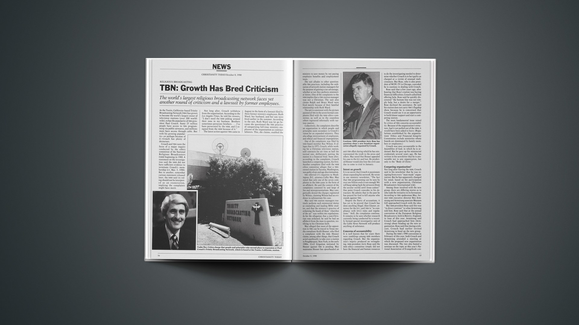 Crouch and TBN were the focus of a major inquiry conducted by the ethics committee of the National Religious Broadcasters (NRB) beginning in 1988. A statement on the investigation said the NRB did not have sufficient evidence to terminate Crouch’s membership (CT, Mar. 5, 1990). But in another, somewhat curious statement released later, the NRB said its ruling should not be interpreted as an exoneration, implying the complaints might have merit.