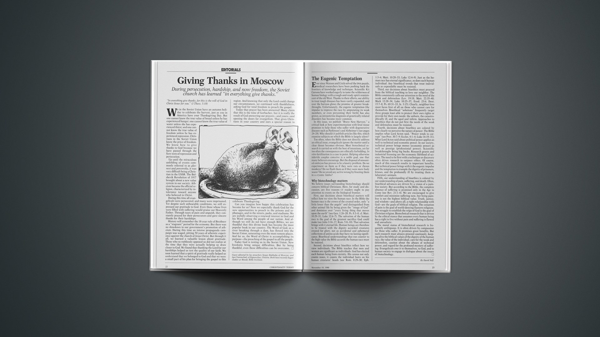 In this issue, we publish “Brave New Harvest,” a critical look at how experimentation with fetal tissue promises to help those who suffer with degenerative diseases such as Parkinson’s and Alzheimer’s (see pages 24–28). Why should CT publish articles like this, which examine subjects on which the Bible is largely silent?