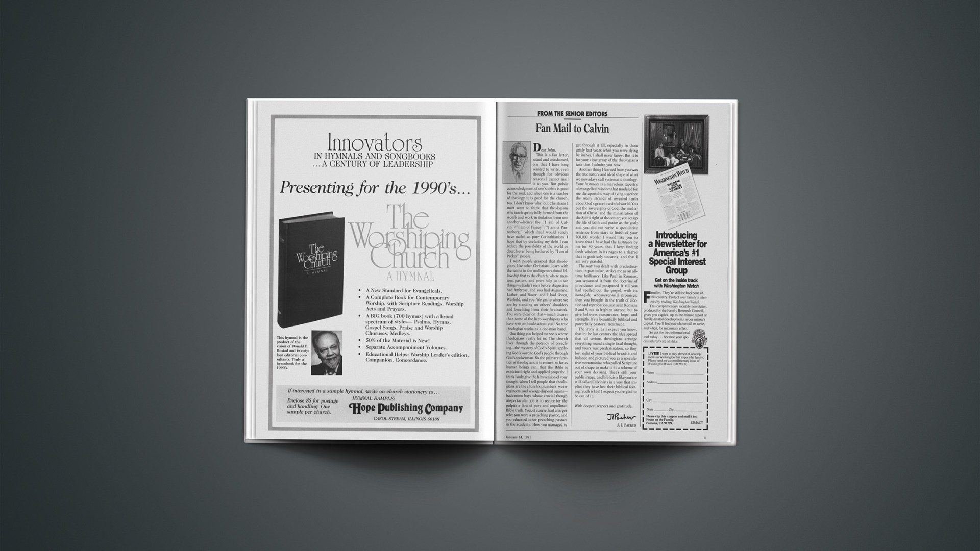 This is a fan letter, naked and unashamed, one that I have long wanted to write, even though for obvious reasons I cannot mail it to you. But public acknowledgment of one’s debts is good for the soul, and when one is a teacher of theology it is good for the church, too. I don’t know why, but Christians I meet seem to think that theologians who teach spring fully formed from the womb and work in isolation from one another—hence the “I am of Calvin” / “I am of Finney” / “I am of Pannenberg,” which Paul would surely have nailed as pure Corinthianism. I hope that by declaring my debt I can reduce the possibility of the world or church ever being bothered by “I am of Packer” people.