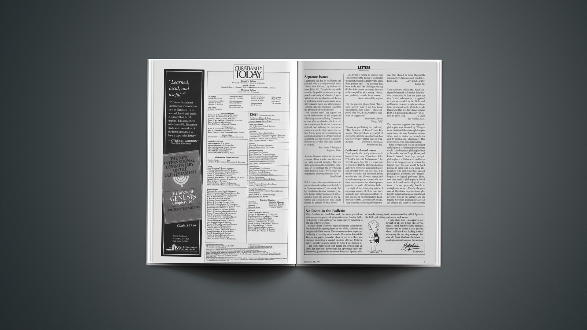 Thank you for the clearly written, well-balanced interview of Mortimer Adler [“Truth’s Intrepid Ambassador,” by Terry C. Muck, Nov. 19]. It is important to remember that the Christian position Adler now represents derives its beauty and strength from the fact that it is neither irrational nor extremist. It has traveled the road of sound reason and in so doing recognizes not only the limits of human reason but also its proper place in the world of Christian faith.