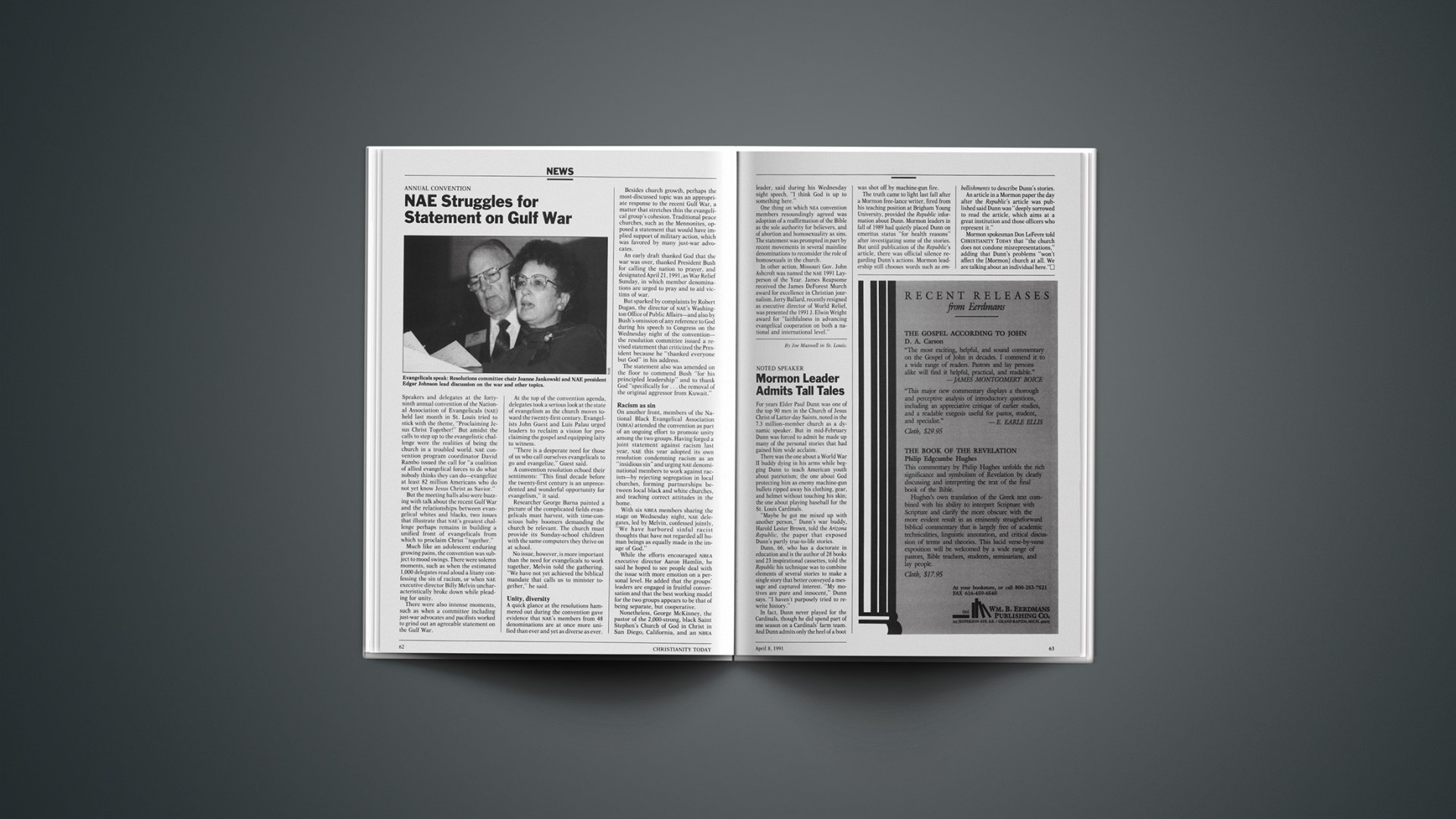 In other action, Missouri Gov. John Ashcroft was named the NAE 1991 Layperson of the Year. James Reapsome received the James DeForest Murch award for excellence in Christian journalism. Jerry Ballard, recently resigned as executive director of World Relief, was presented the 1991 J. Elwin Wright award for “faithfulness in advancing evangelical cooperation on both a national and international level.”