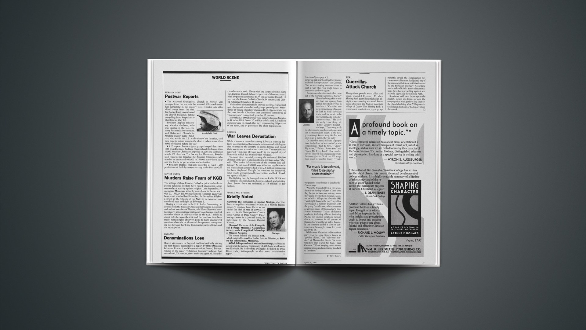 The killings of three Russian Orthodox priests who championed religious freedom have raised speculation about renewed KGB activity against religion. Last September, Fr. Alexander Menn was killed by an ax blow to the neck (CT, Oct. 22, 1990, p. 60). Orthodox monk Hegumen Lazar was beaten and stabbed last December; Fr. Seraphim Shlykov, a priest at the Church of the Nativity in Moscow, was murdered near midnight on February 1.