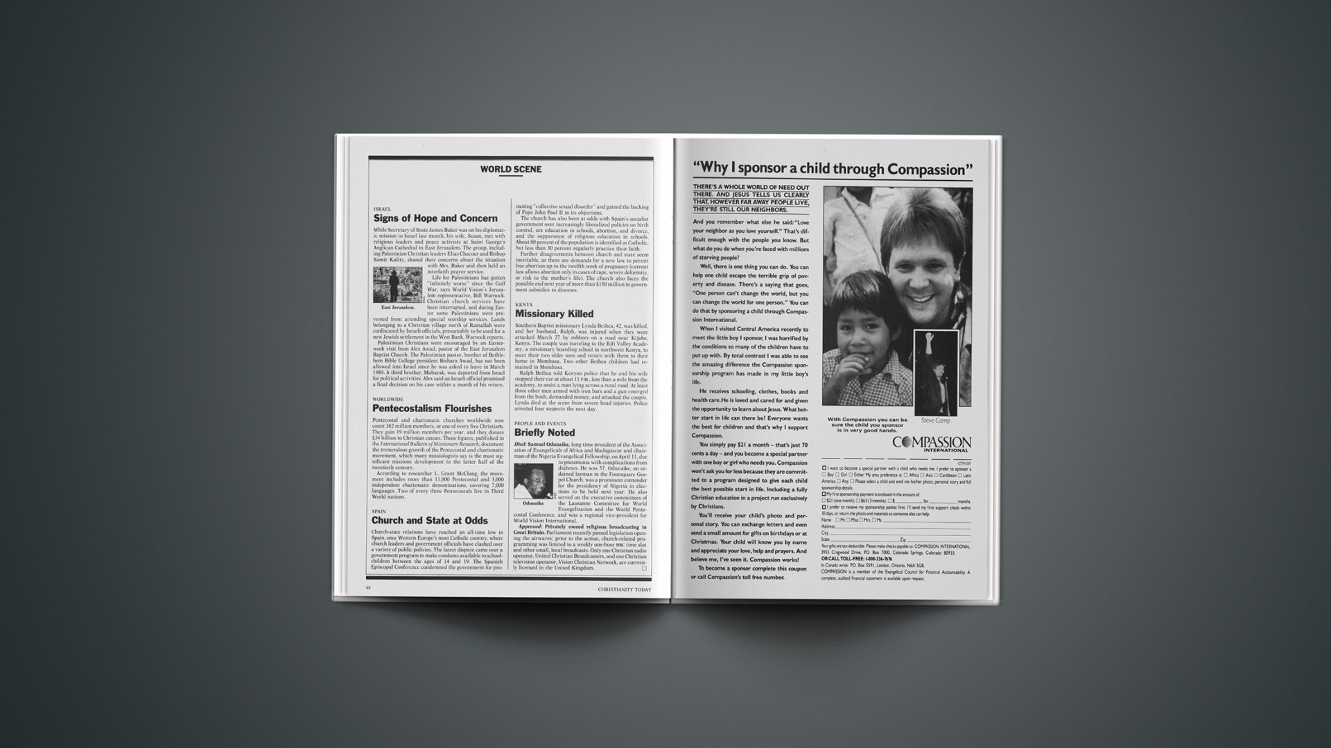 Died: Samuel Odunaike, long-time president of the Association of Evangelicals of Africa and Madagascar and chairman of the Nigeria Evangelical Fellowship, on April 11, due to pneumonia with complications from diabetes. He was 57. Odunaike, an ordained layman in the Foursquare Gospel Church, was a prominent contender for the presidency of Nigeria in elections to be held next year. He also served on the executive committees of the Lausanne Committee for World Evangelization and the World Pentecostal Conference, and was a regional vice-president for World Vision International.