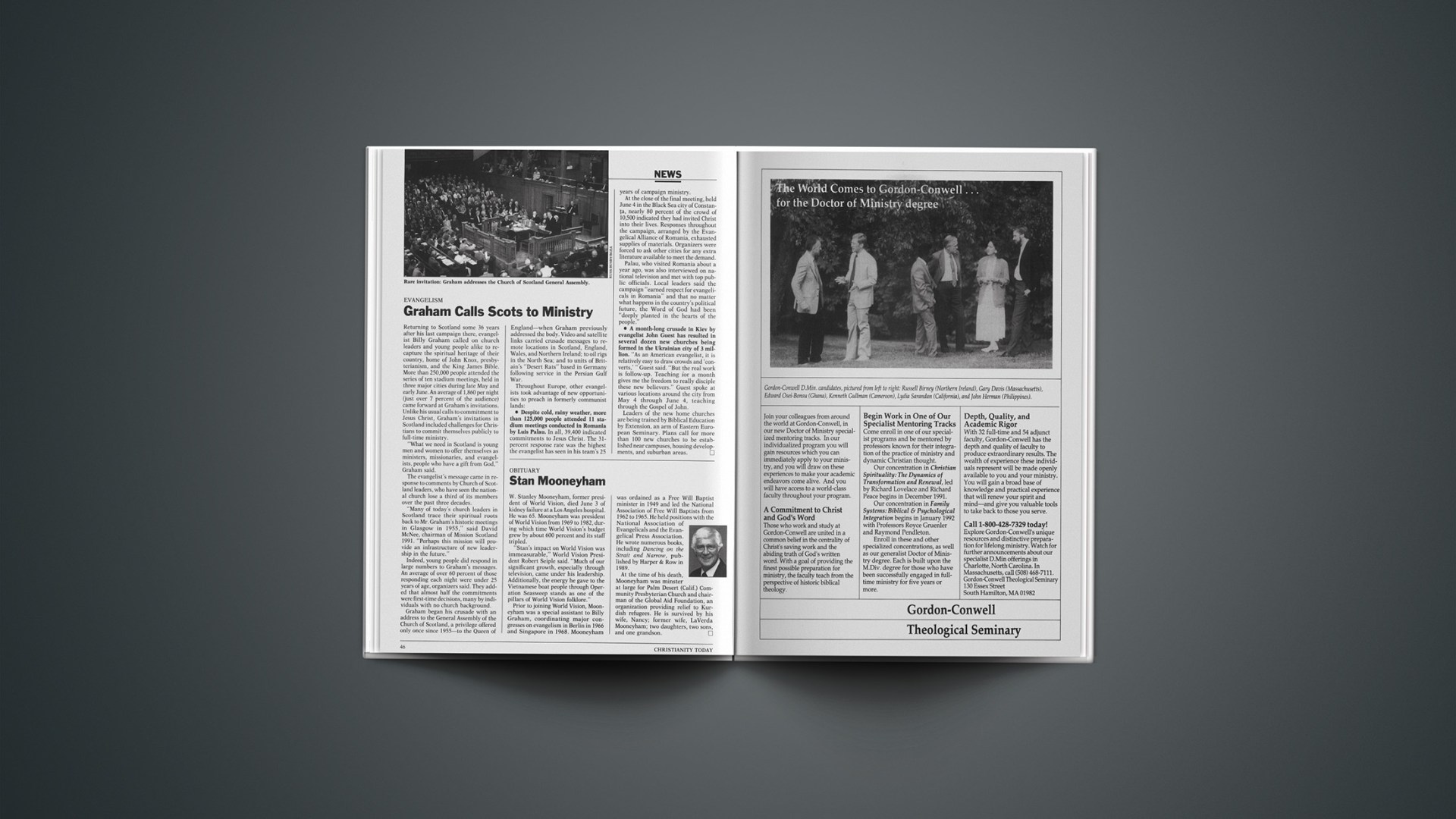 Returning to Scotland some 36 years after his last campaign there, evangelist Billy Graham called on church leaders and young people alike to recapture the spiritual heritage of their country, home of John Knox, presbyterianism, and the King James Bible. More than 250,000 people attended the series of ten stadium meetings, held in three major cities during late May and early June. An average of 1,860 per night (just over 7 percent of the audience) came forward at Graham’s invitations. Unlike his usual calls to commitment to Jesus Christ, Graham’s invitations in Scotland included challenges for Christians to commit themselves publicly to full-time ministry.