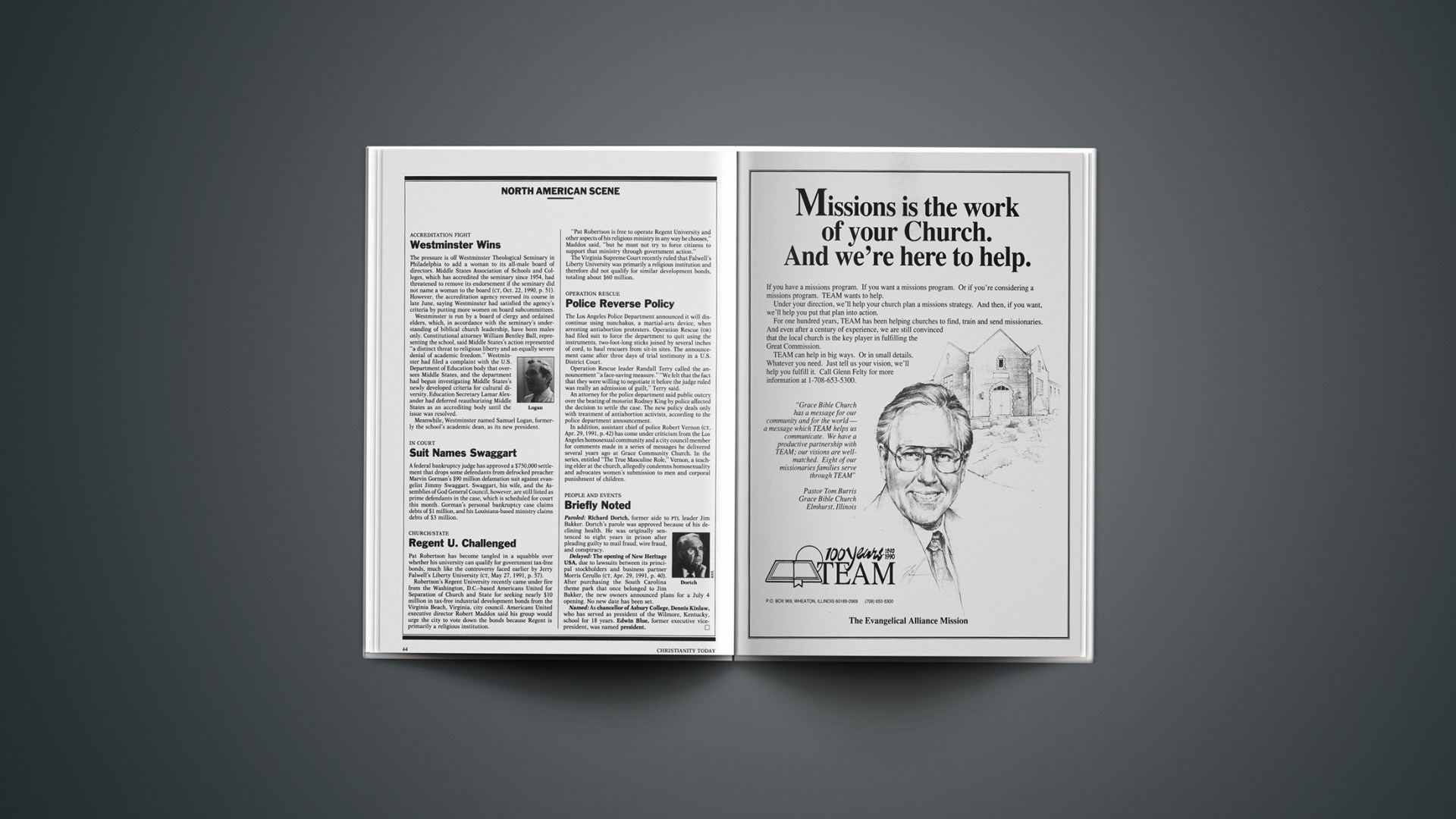 Delayed: The opening of New Heritage USA, due to lawsuits between its principal stockholders and business partner Morris Cerullo (CT, Apr. 29, 1991, p. 40). After purchasing the South Carolina theme park that once belonged to Jim Bakker, the new owners announced plans for a July 4 opening. No new date has been set.