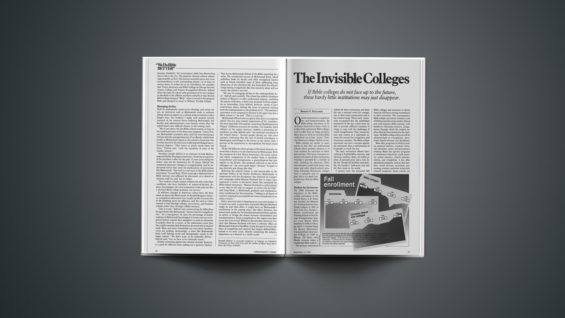 Outside mainstream evangelicalism and fundamentalism, the Bible-college movement is little known. And even in these circles, it is often little understood. Bible colleges tend to suffer from an image problem. Many perceive them as extended Bible conferences—or, at best, “junior” Christian liberal-arts colleges. Neither is true.