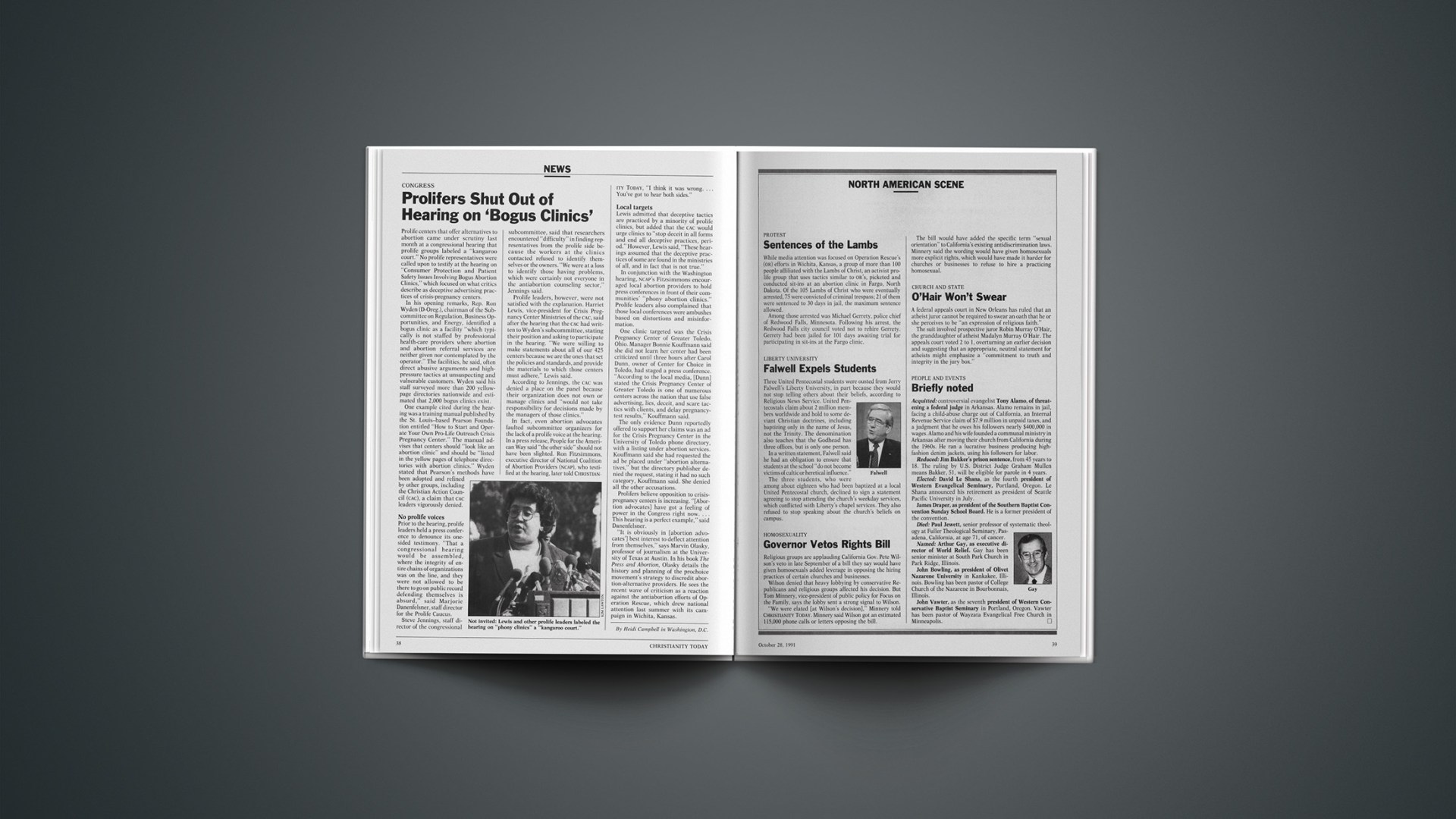 In fact, even abortion advocates faulted subcommittee organizers for the lack of a prolife voice at the hearing. In a press release, People for the American Way said “the other side” should not have been slighted. Ron Fitzsimmons, executive director of National Coalition of Abortion Providers (NCAP), who testified at the hearing, later told CHRISTIANITY TODAY, “I think it was wrong.… You’ve got to hear both sides.”