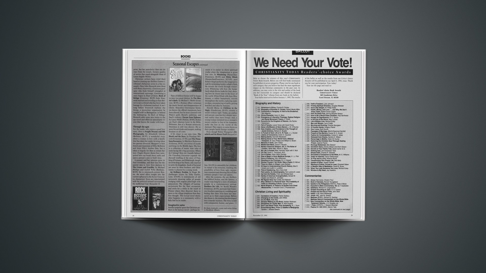 Help us choose the winners of this year’s CHRISTIANITY TODAY Book Awards. Below you will find books nominated by publishers in seven categories. Please vote for one book in each category that you believe has had the most significant impact on the Christian community in the past year. In addition, you may write in the title and author of the book you feel transcends its category and should be declared “Book of the Year” (choose from any book on the ballot). Your ballot must arrive before January 1,1992. The results of the ballot as well as the results from our Critics’-choice Awards will be published in our April 6, 1992, issue. Thank you for your participation. Vote today! Tear out the page and mail to: