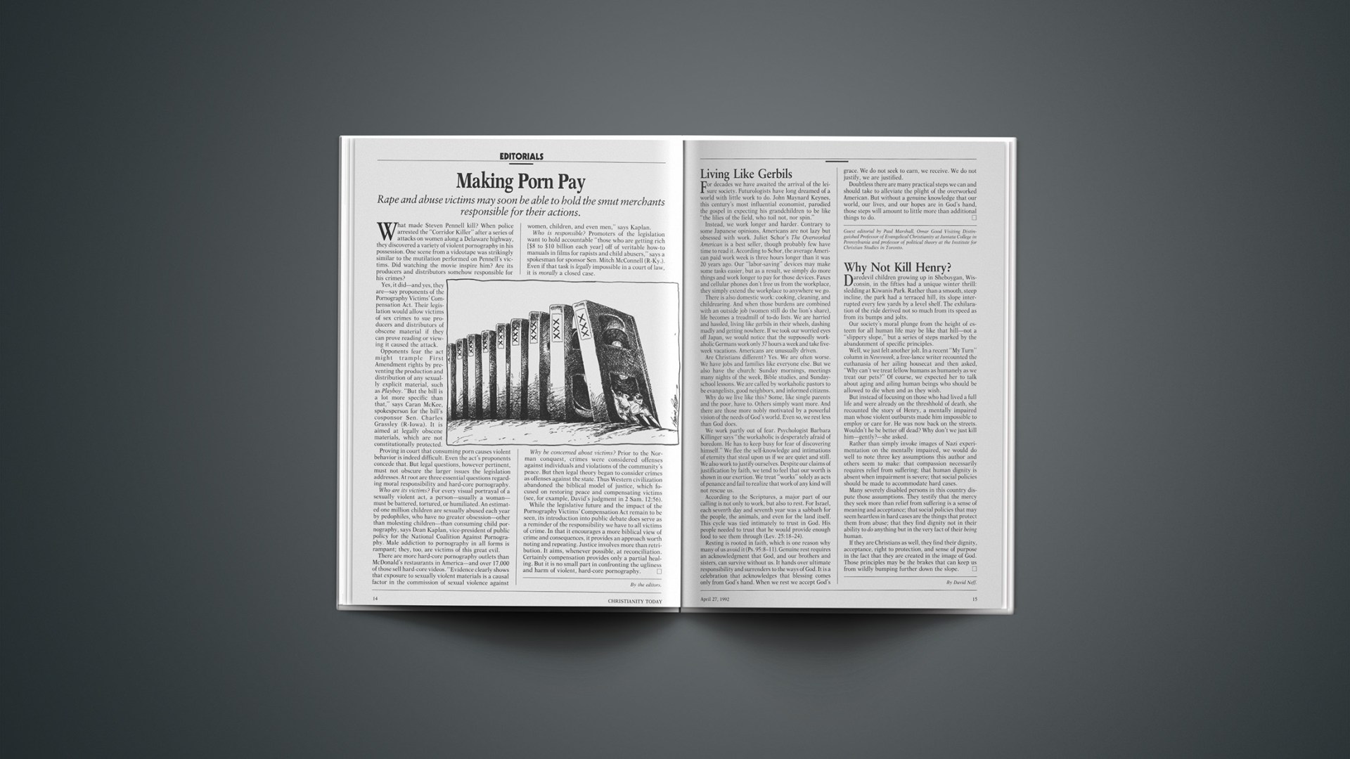 Proving in court that consuming porn causes violent behavior is indeed difficult. Even the act’s proponents concede that. But legal questions, however pertinent, must not obscure the larger issues the legislation addresses. At root are three essential questions regarding moral responsibility and hard-core pornography.