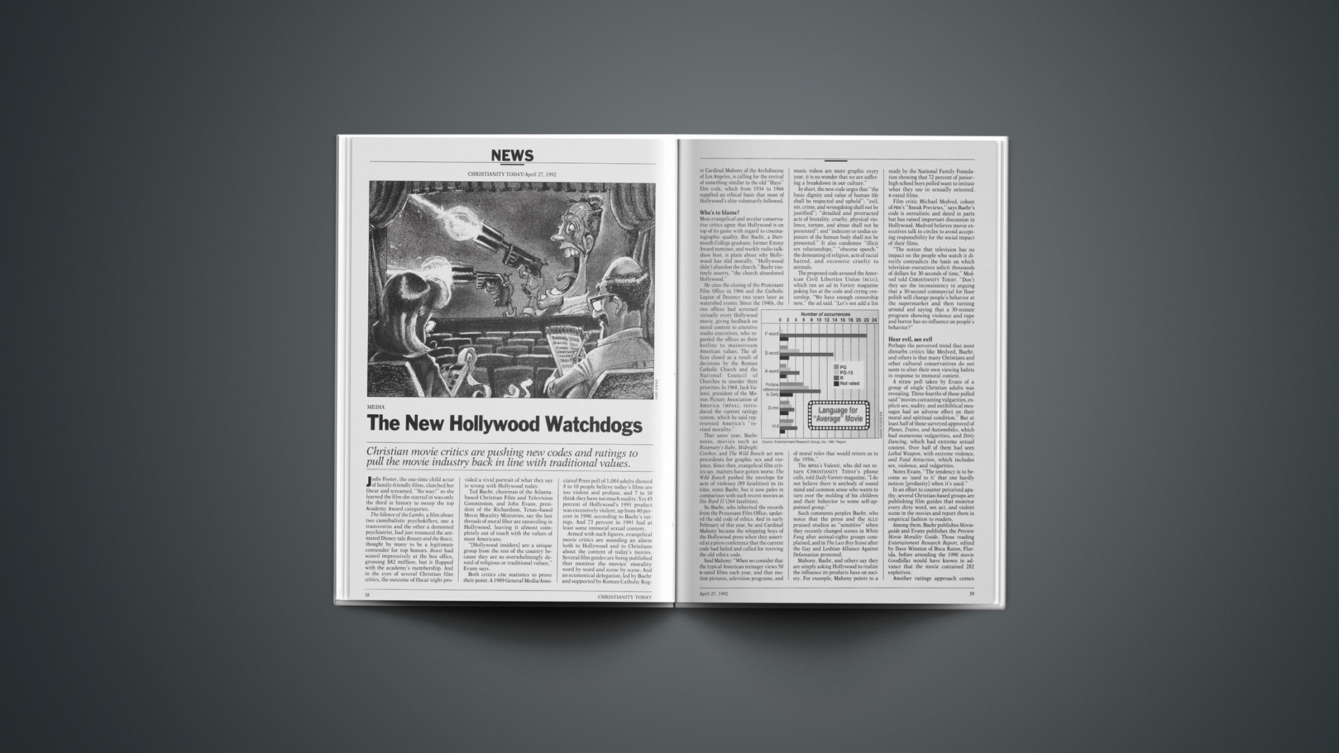 Both critics cite statistics to prove their point. A 1989 General Media/Associated Press poll of 1,084 adults showed 8 in 10 people believe today’s films are too violent and profane, and 7 in 10 think they have too much nudity. Yet 45 percent of Hollywood’s 1991 product was excessively violent, up from 40 percent in 1990, according to Baehr’s ratings. And 73 percent in 1991 had at least some immoral sexual content.