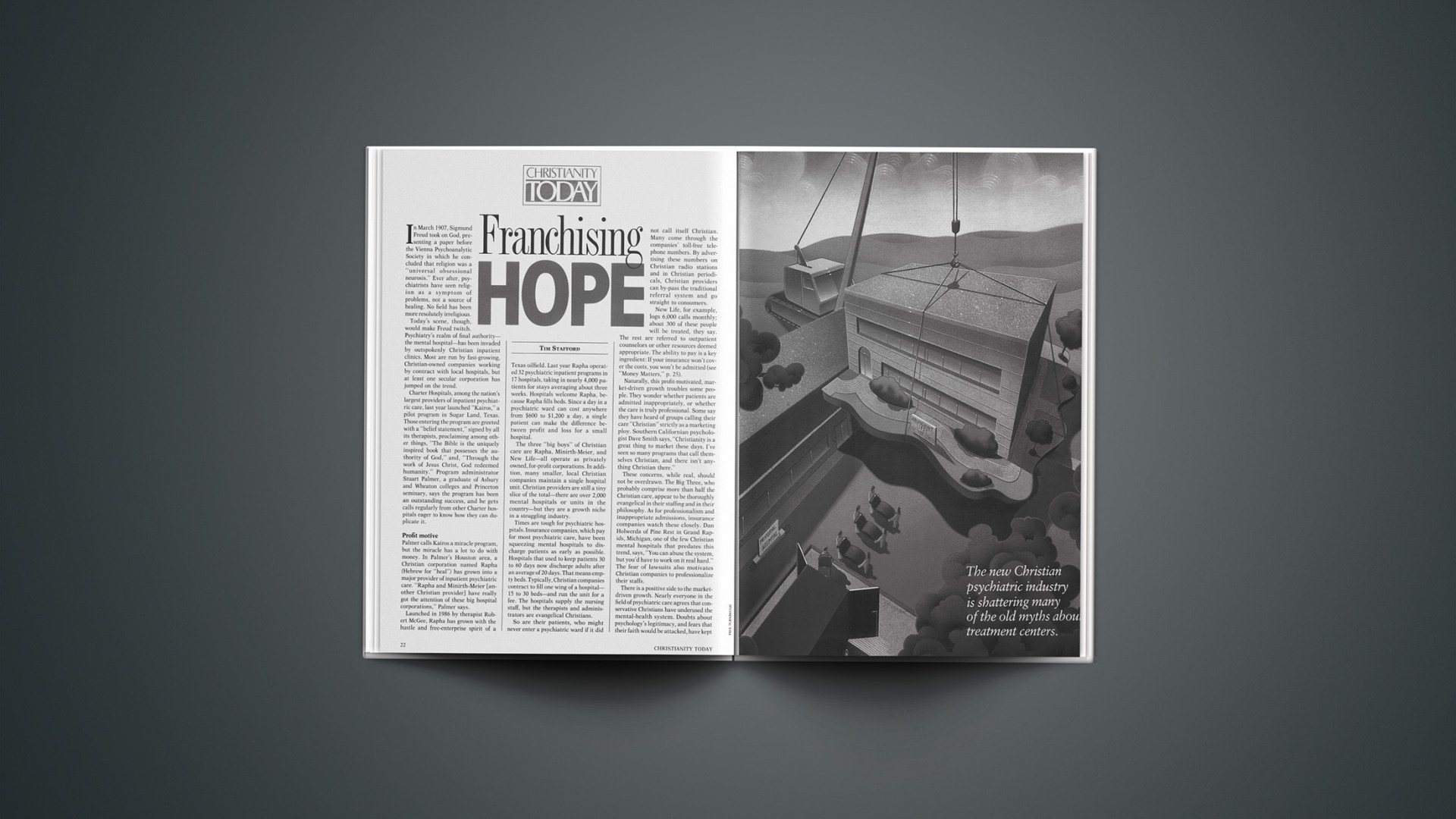 Times are tough for psychiatric hospitals. Insurance companies, which pay for most psychiatric care, have been squeezing mental hospitals to discharge patients as early as possible. Hospitals that used to keep patients 30 to 60 days now discharge adults after an average of 20 days. That means empty beds. Typically, Christian companies contract to fill one wing of a hospital—15 to 30 beds—and run the unit for a fee. The hospitals supply the nursing staff, but the therapists and administrators are evangelical Christians.