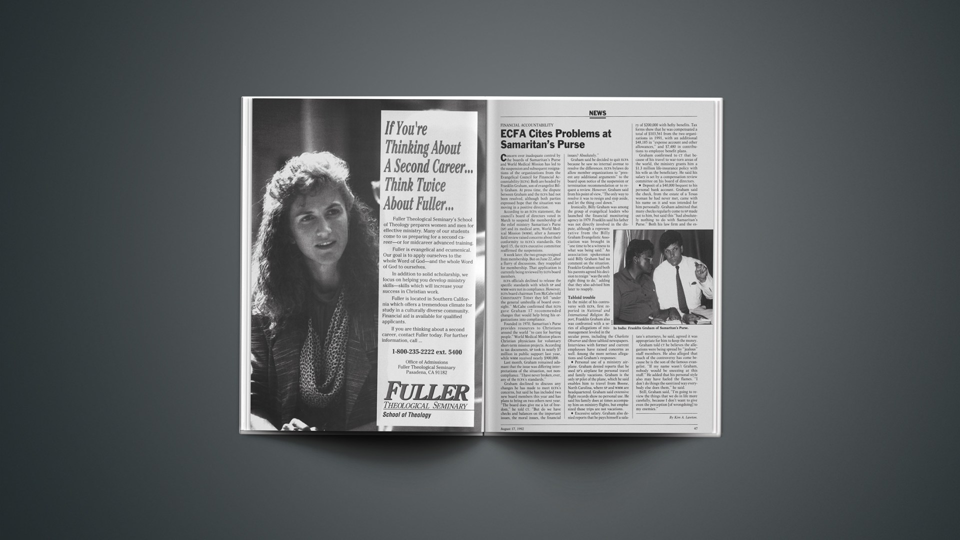 Concern over inadequate control by the boards of Samaritan’s Purse and World Medical Mission has led to the suspension and subsequent resignations of the organizations from the Evangelical Council for Financial Accountability (ECFA). Both are headed by Franklin Graham, son of evangelist Billy Graham. At press time, the dispute between Graham and the ECFA had not been resolved, although both parties expressed hope that the situation was moving in a positive direction.