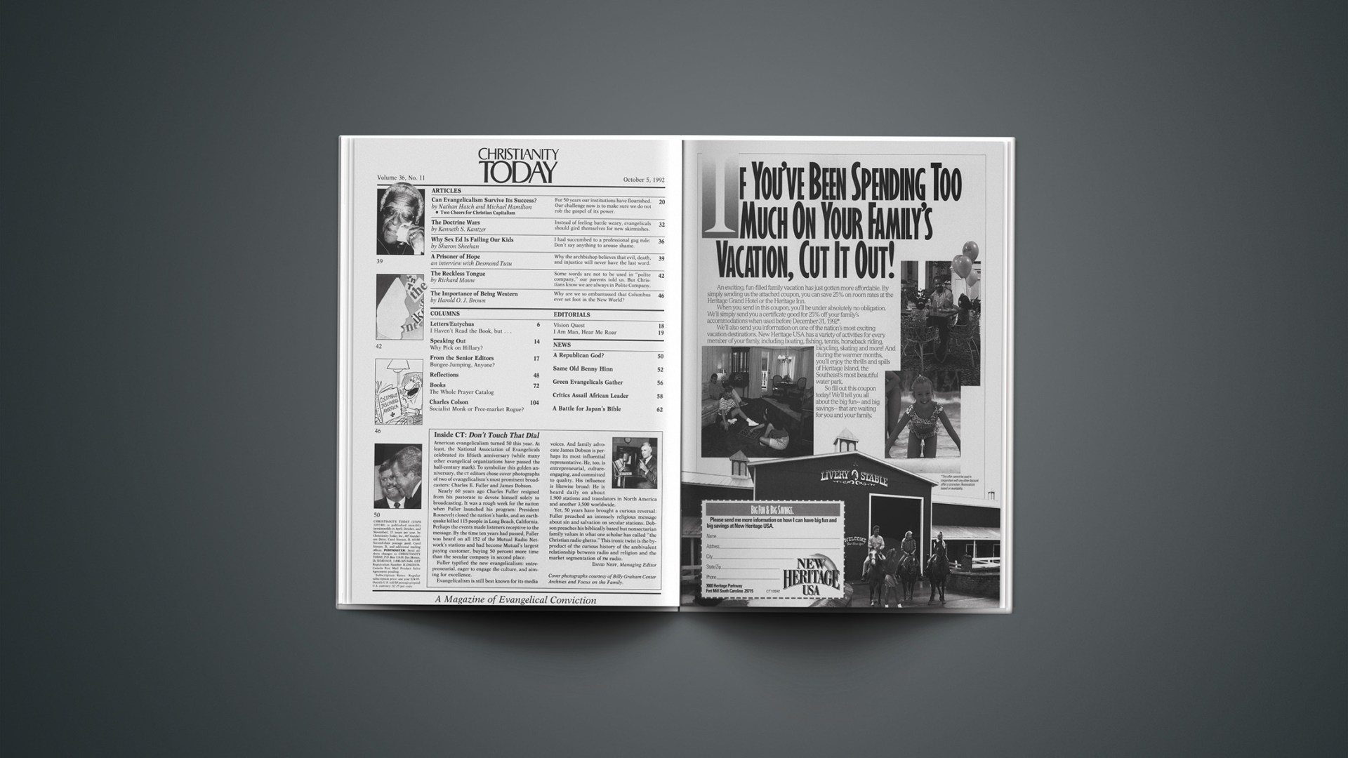 American evangelicalism turned 50 this year. At least, the National Association of Evangelicals celebrated its fiftieth anniversary (while many other evangelical organizations have passed the half-century mark). To symbolize this golden anniversary, the CT editors chose cover photographs of two of evangelicalism’s most prominent broadcasters: Charles E. Fuller and James Dobson.