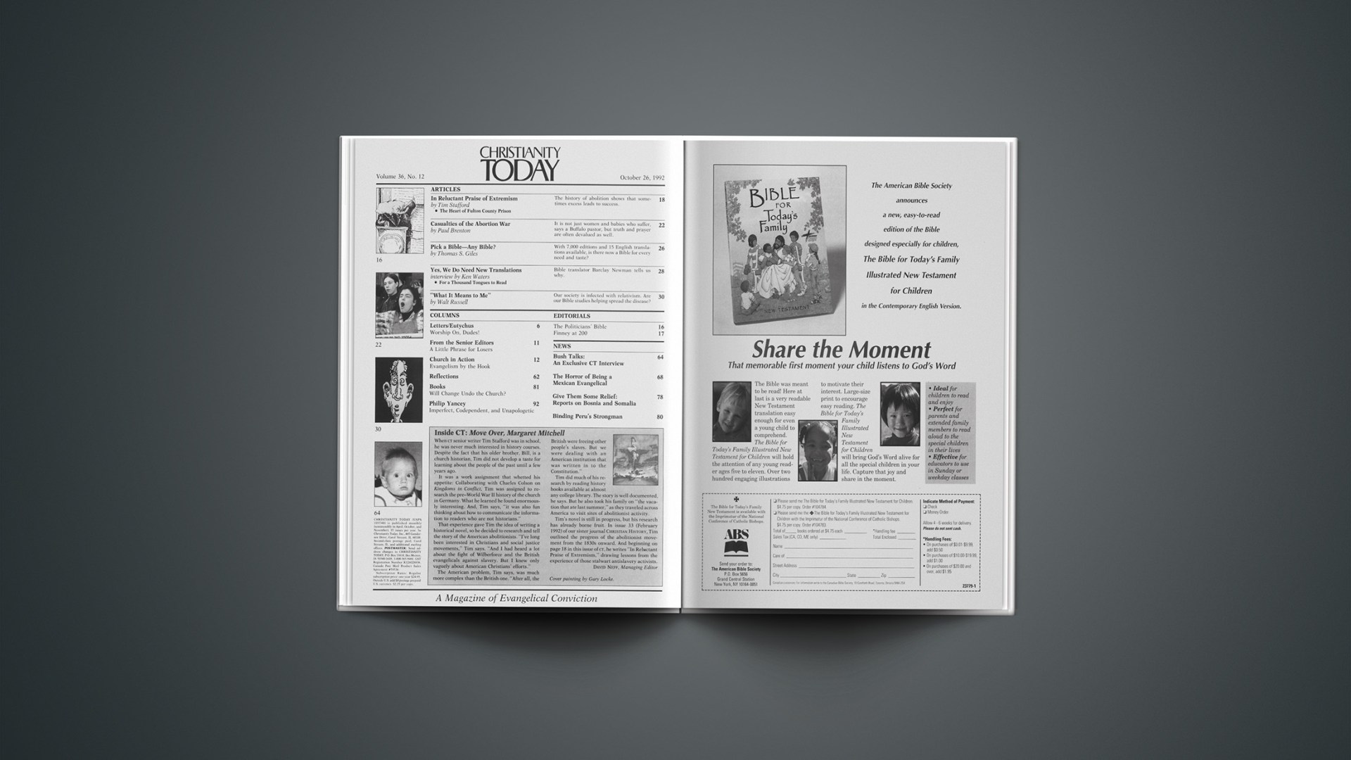 Tim’s novel is still in progress, but his research has already borne fruit. In issue 33 (February 1992) of our sister journal CHRISTIAN HISTORY, Tim outlined the progress of the abolitionist movement from the 1830s onward. And beginning on page 18 in this issue of CT, he writes “In Reluctant Praise of Extremism,” drawing lessons from the experience of those stalwart antislavery activists.