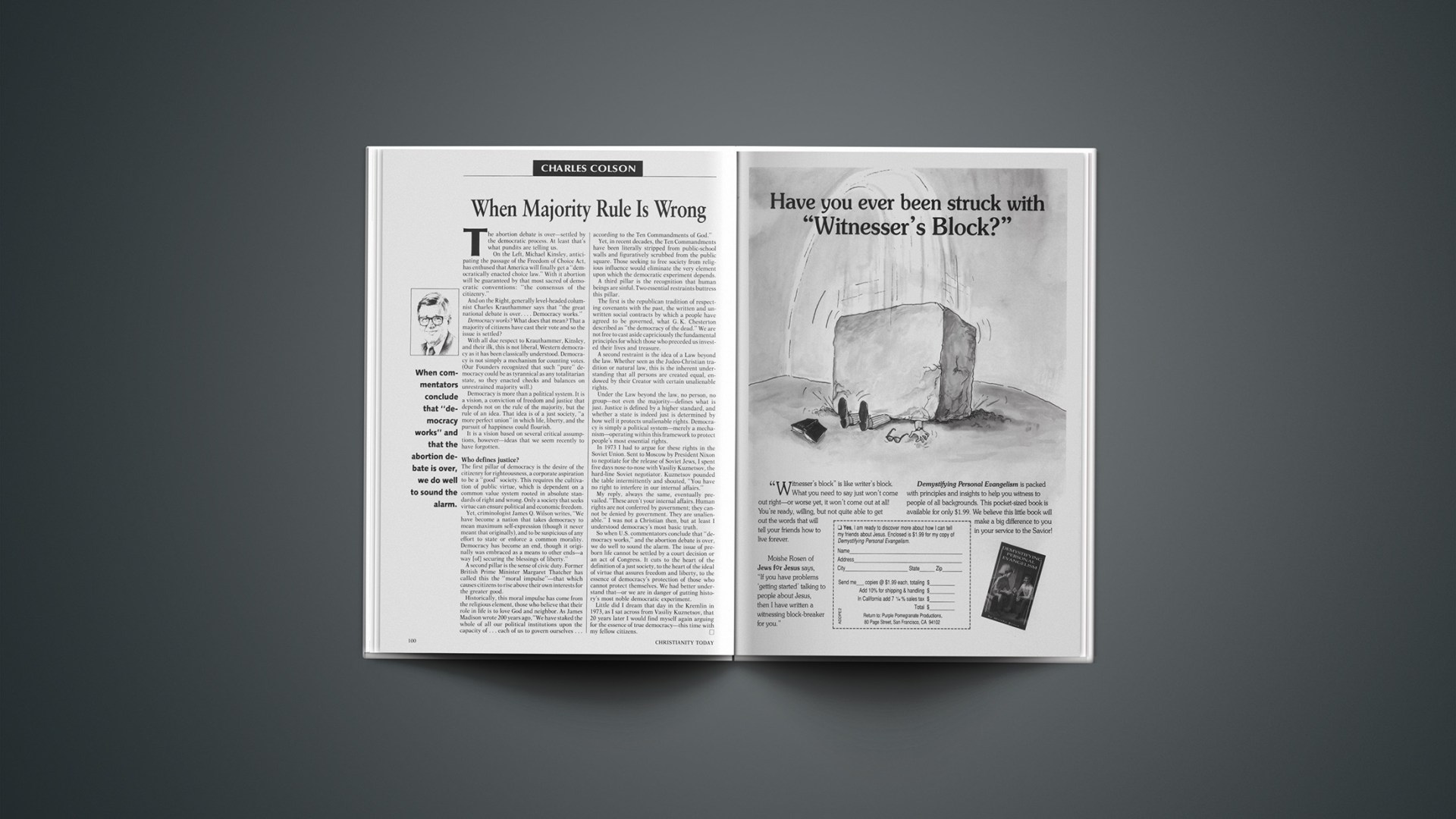 On the Left, Michael Kinsley, anticipating the passage of the Freedom of Choice Act, has enthused that America will finally get a “democratically enacted choice law.” With it abortion will be guaranteed by that most sacred of democratic conventions: “the consensus of the citizenry.”