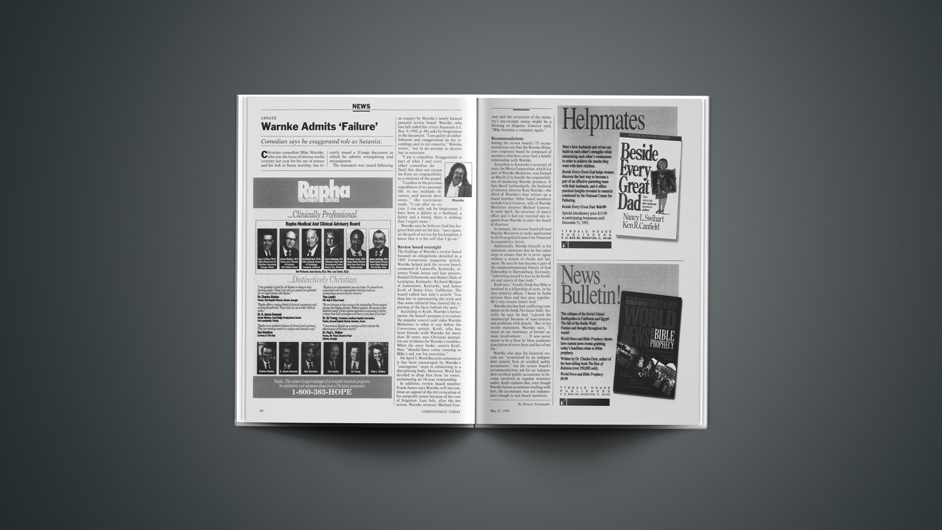 The statement was issued following an inquiry by Warnke’s newly formed pastoral review board. Warnke, who last fall called his critics Satanists (CT, Nov. 9, 1992, p. 49), asks for forgiveness in the document. “I am guilty of embellishment and exaggeration on my recordings and in my concerts,” Warnke writes, “not in an attempt to deceive but to entertain.