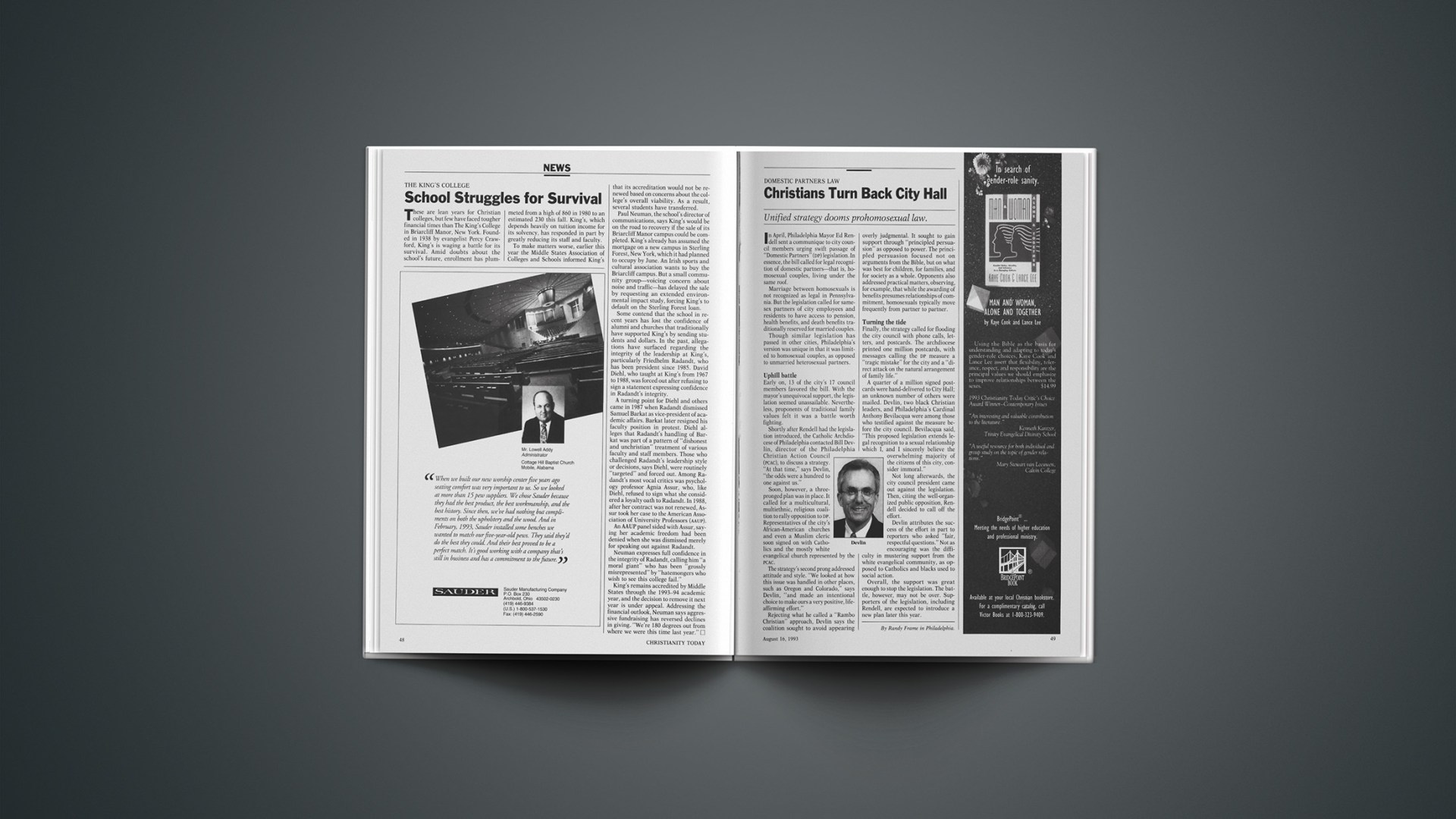 These are lean years for Christian colleges, but few have faced tougher financial times than The King’s College in Briarcliff Manor, New York. Founded in 1938 by evangelist Percy Crawford, King’s is waging a battle for its survival. Amid doubts about the school’s future, enrollment has plummeted from a high of 860 in 1980 to an estimated 230 this fall. King’s, which depends heavily on tuition income for its solvency, has responded in part by greatly reducing its staff and faculty.