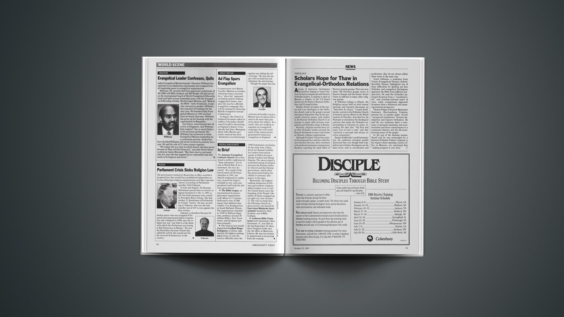 In July and August, the Russian Parliament passed laws to restrict religious freedom (CT, Oct. 4, 1993, p. 62), but both measures were vetoed by President Boris Yeltsin. The September 21 dissolution of Parliament by Yeltsin “buries” the law, according to Yakunin, who was the lone member out of 167 to vote against the first version.
