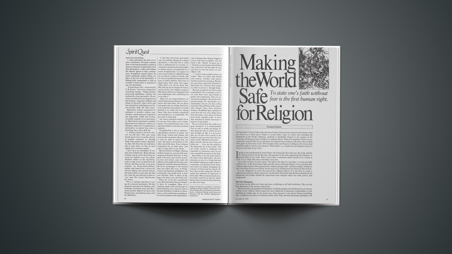 On September 2, Prison Fellowship chairman Charles Colson faced a situation that mirrors what the church as a whole faces. People of several faiths, many of whom were attending the Parliament of the World’s Religions, gathered at Rockefeller Chapel on the campus of the University of Chicago to hear an address on religious liberty. What do evangelicals have to say in a pluralistic setting? How do we talk about the cultural role of religion with those who worship other gods? As the winner of the 1993 Templeton Prize for Progress in Religion, Mr. Colson had earned the right to stand on the platform. What follows is a condensed and adapted version of what he said when he got there.