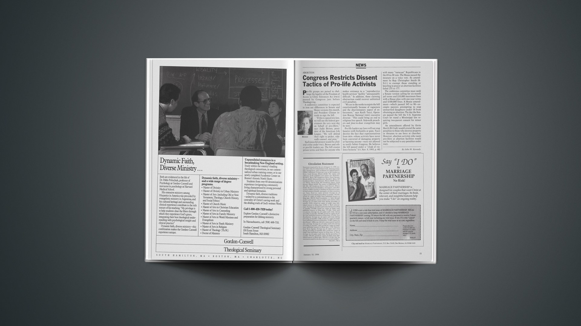 Pro-life leaders say laws will not stop fanatics with firebombs or guns. Tucci decries the fact that representatives from ORN—whose activists have never been convicted of damaging property or harming anyone—were not allowed to testify before Congress. He believes the bill passed under a “cloak of violence hysteria” (CT, Nov. 8, 1993, p. 40) with many “turncoat” Republicans in the 69-to-30 vote. The House passed the measure on a voice vote. An amendment by Rep. Christopher Smith (R-N.J.) to exempt those standing or kneeling in prayer at abortion facilities failed 255 to 177.